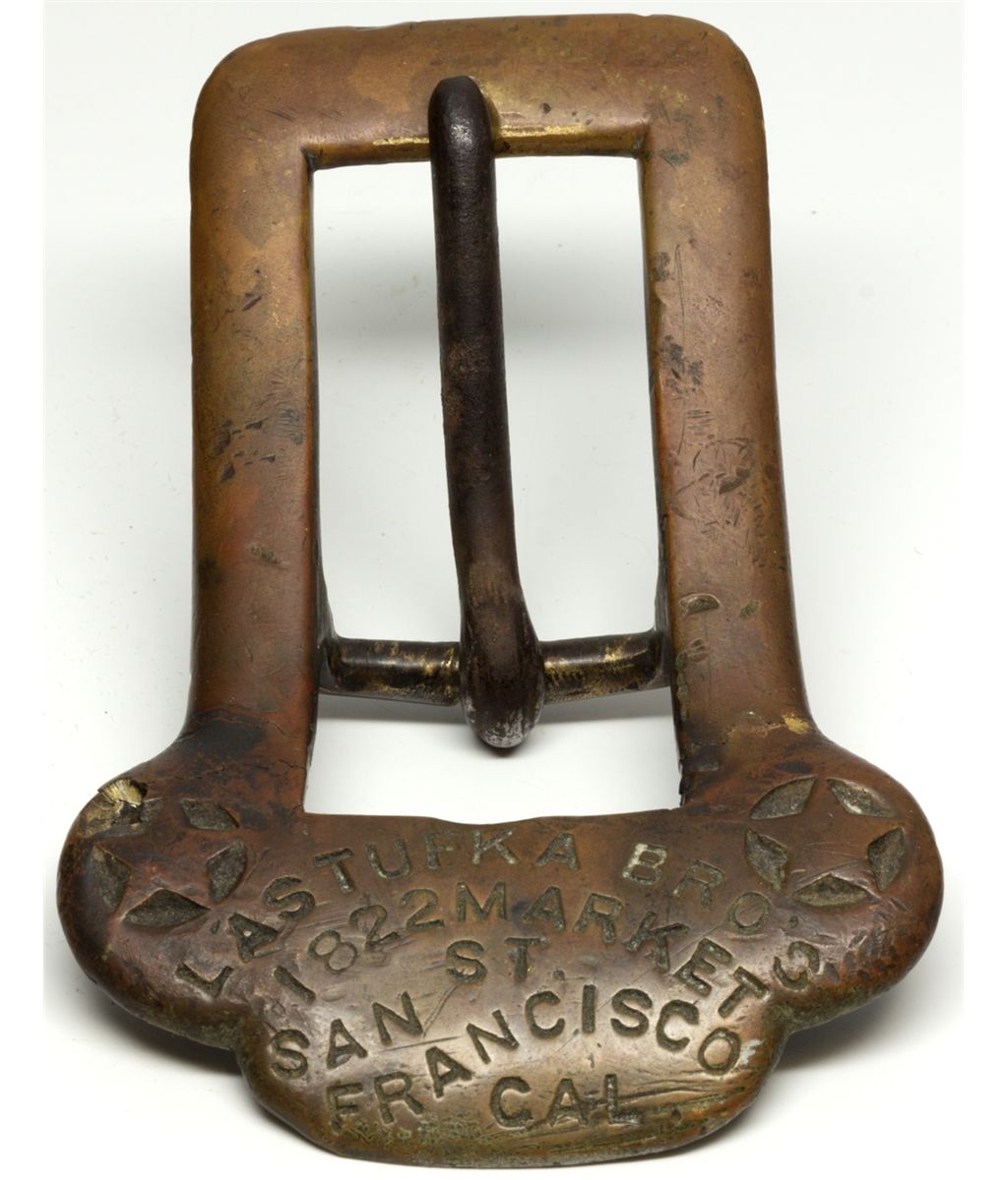 The Lastufka Brothers Company, manufacturers and dealers in both fine and draft harness and horse boots, seems to have begun some time in the late 1880s. By 1889, F. J. Lastufka was listed as a carriage trimmer. Throughout the period between the 1880s and 1910, the business moved frequently to new locations on Market Street. According to the book San Francisco: Her Great Manufacturing, Commercial, and Financial Institutions, "Prominent among those who manufacture high grade harness and saddles is the firm of Lastufka Bros.,….They were established in 1899, and their retail and manufacturing departments are in the rear of their place of business, giving steady employment to a number of skilled workmen. In conjunction with harness and saddles, they manufacture whips and deal extensively in horse clothing. “ This lot consists of a 5.75" long harness buckle, the front imprinted "Lastufka Bro`s/ 1822 Market/ St./ San/ Francisco/ Cal." below two star designs. This lower portion of the buckle is deeply cracked in two places, and seems to have once been plated, though it now shows a red and black patina. This buckle dates from the early 1900s, when the business was located at 1822 Mission Street. City: [/b]San FranciscoCounty: State: CA