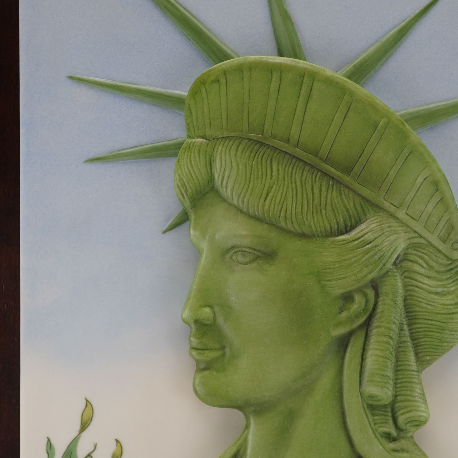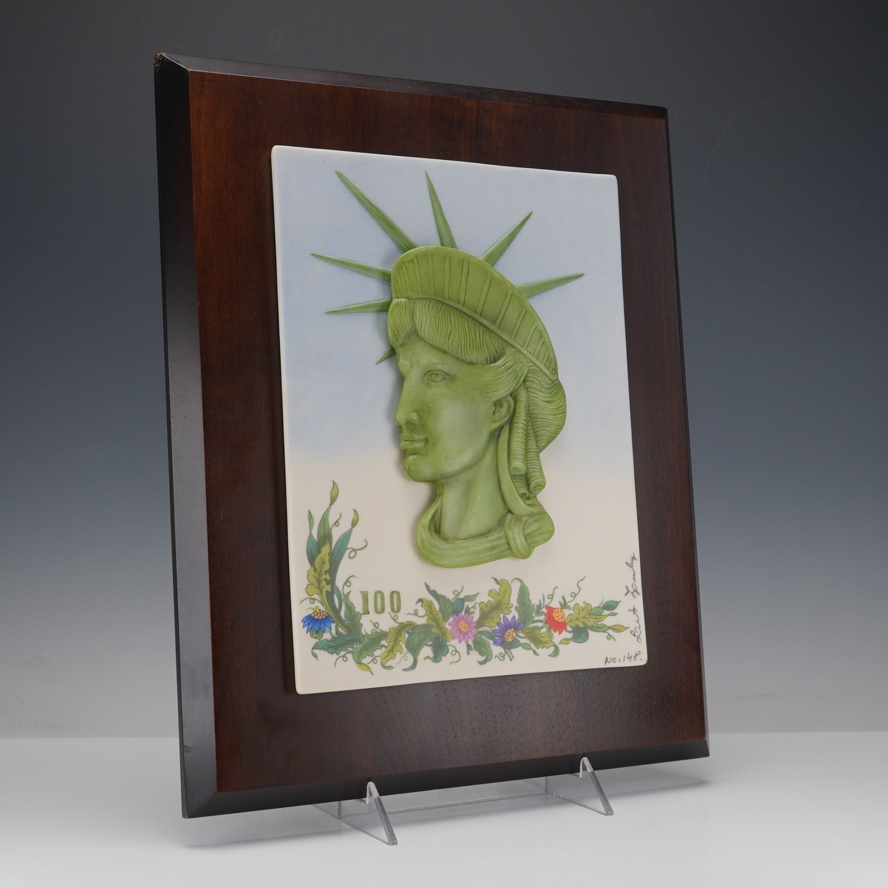 A bas relief porcelain plaque, designed by the renowned sculptor Laszlo Ispanky and numbered 148. It features a prominent three dimensional representation of the Statue of Liberty's head and diadem. The central effigy is rendered in a light-green hue, contrasting starkly with the pale blue and white ground of the rectangular porcelain field. The left corner marked with "100" celebrating the anniversary of the Statue of Liberty. It is affixed to a rectangular wooden backing. "No. 148" signed to lower right corner. Laszlo Ispanky signed to right side.