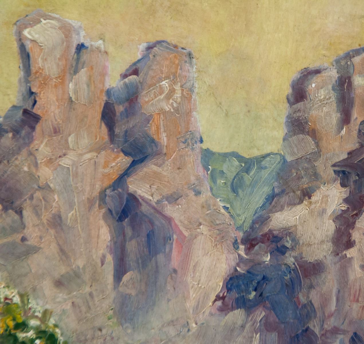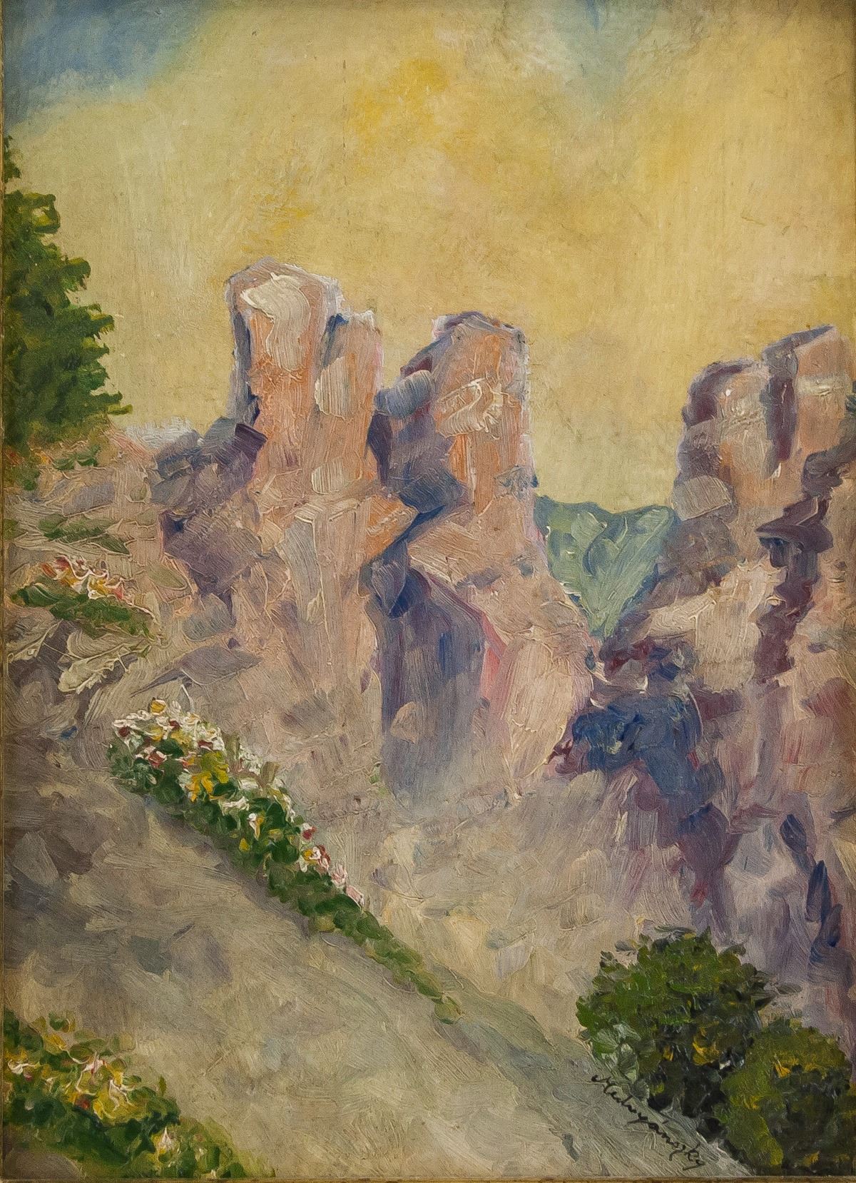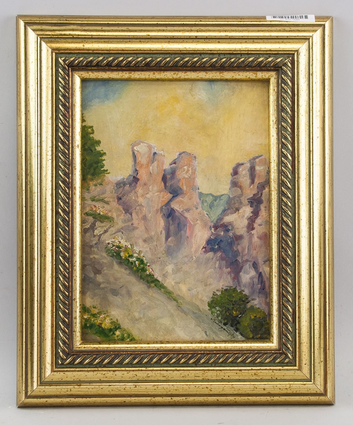 Oil on board, framed. Featuring a landscape scene of cliffs with small pathway. Signed Mednyanszky on the lower right corner. Attributed to Laszlo Mednyanszky (1852-1919, Hungarian). 25.5 x 18.5 cm (10.0 x 7.3 inches). Framed size: 36 x 29.5 cm (14.2 x 11.6 inches). PROVENANCE: Private collection (Hungary). Acquired from above, Private Canadian collection.