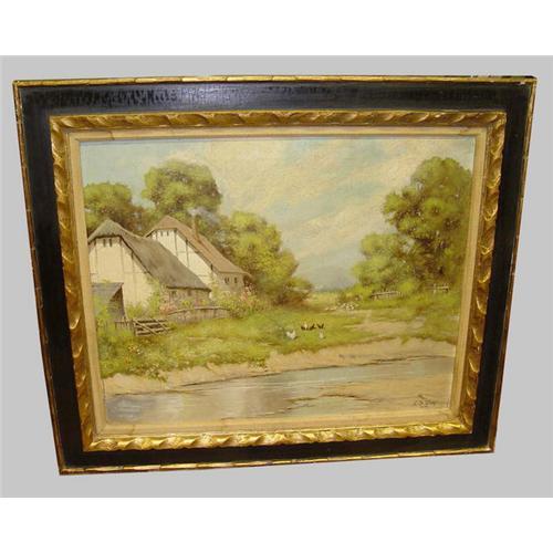 Laszlo Neogrady Hungarian 1900-1962. The painting signed L Neogrady lower right, depicts a colorful impressionist landscape with livestock beside the cottage in the foreground and a mountainous landscape in the distance. The painting measures 24 inches x 30 inches and is mounted in a 32.5 x 38.5 inch parcel gilt wood frame. The painting has some drying and crackling to the paint as well as several repairs to the canvas and the associated touch-ups. Overall it is a wonderful landscape scene atypical of Neogrady snow scenes and would make a splendid gift or addition to any fine household or collection. ****NOTE: Email for larger images.
