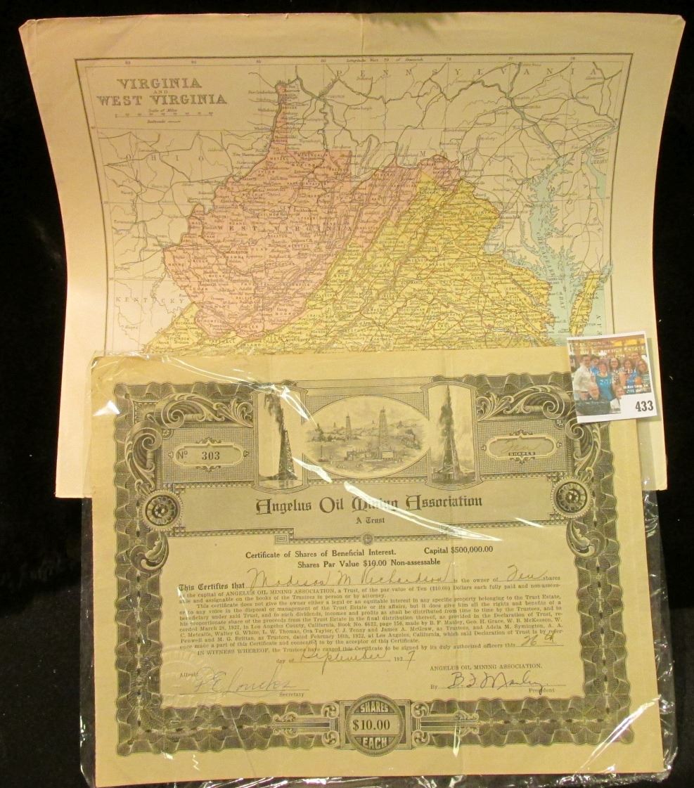 Late 1800 era Map of Railroad Map of Virginia & West Virginia, mounted & ready for framing; cancelled National Guard of the U.S. Stamp; 1927 Stock Certificate for 10 shares of "Angeles Oil Mining Association".