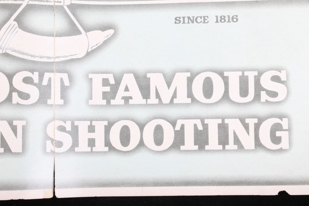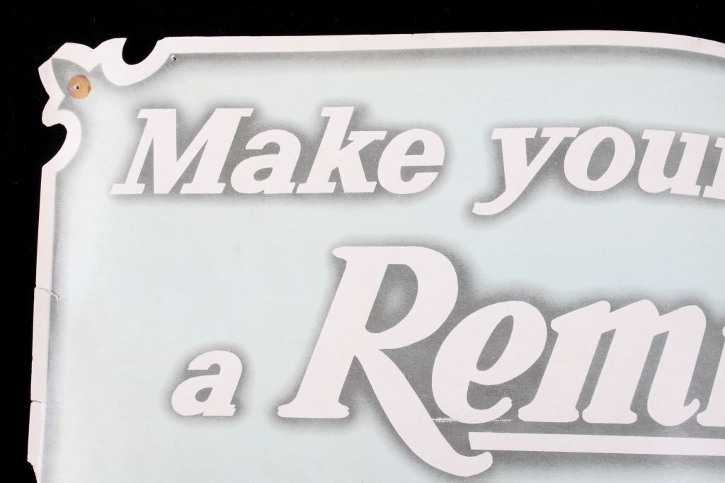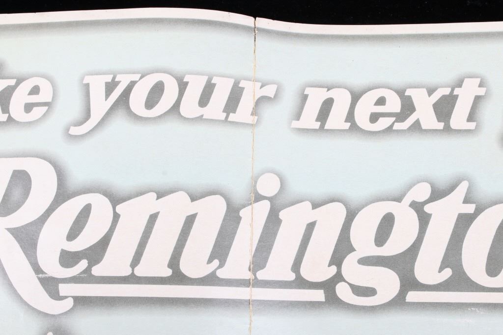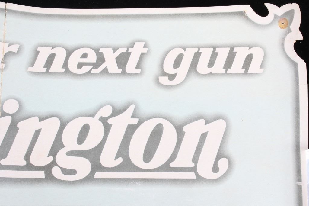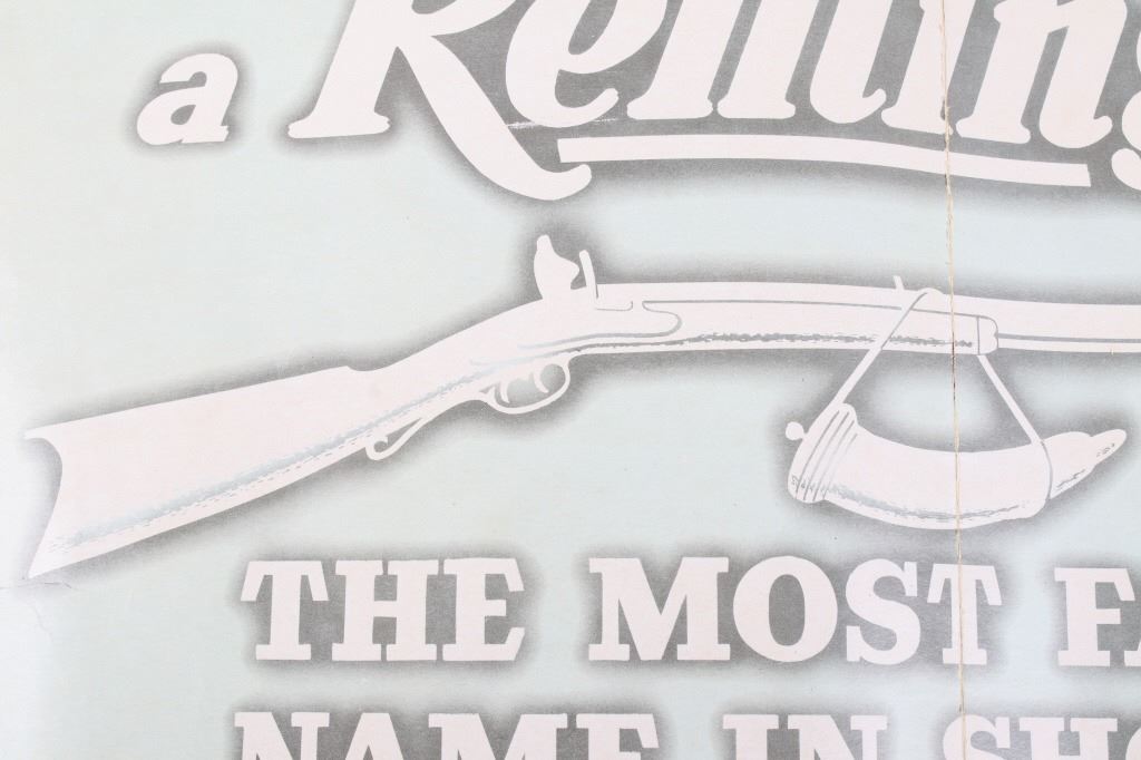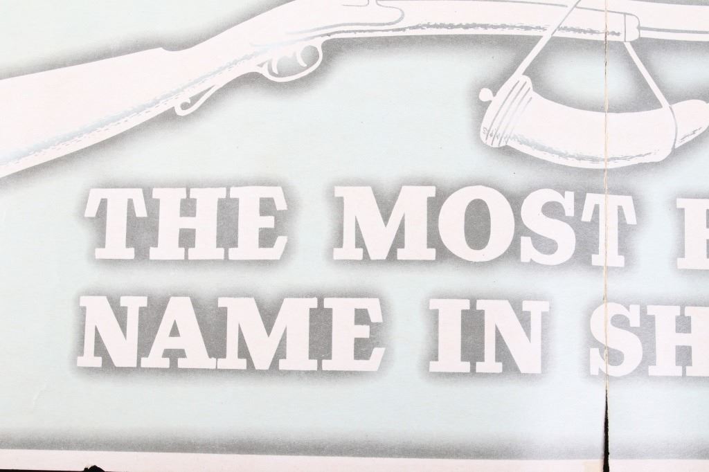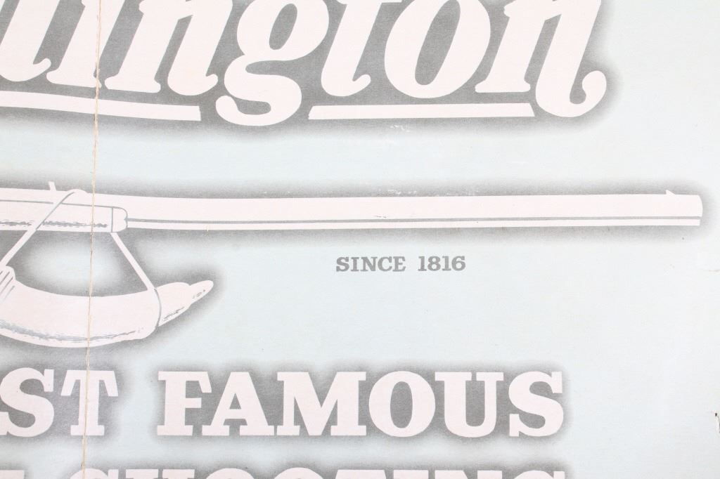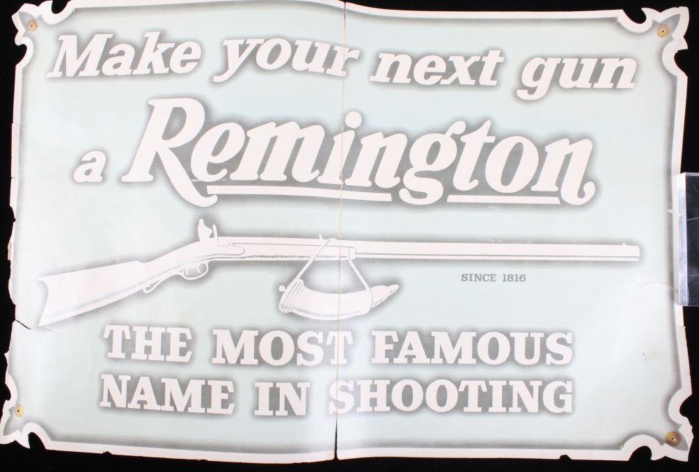 Featured in this lot we have a paper Remington Arms Co. store advertising poster originating from the late 1880's. The poster displays a faded green background with a white border around the piece. The poster shows a black powder rifle at the center with white lettering across the top and bottom. The piece is marked "Make your next gun a Remington - since 1816 - The Most famous name in shooting". The poster shows good condition for its age with wear across the perimeter. The advertising sign measures 13 1/2" tall by 21" wide.