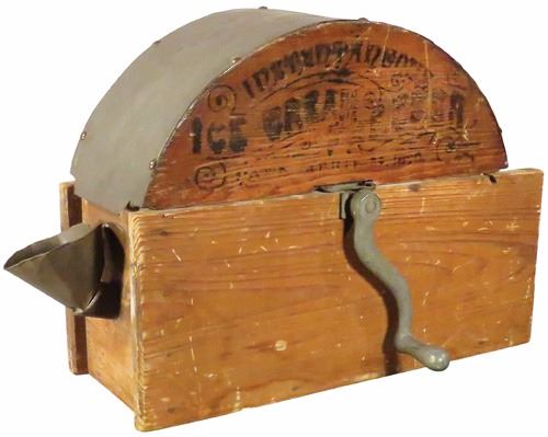 Late 1800's Primative Ice Cream Freezer. Wood and tin with original decals. 16 X 12 X 6 inches.