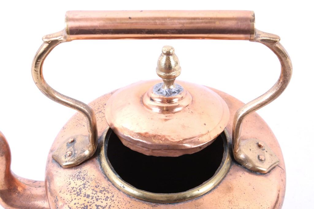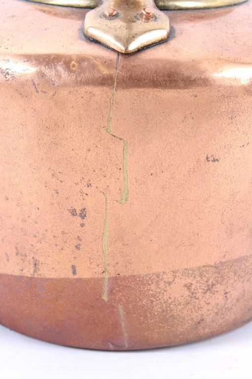 For your bidding pleasure is this Late 1800s Gooseneck Copper Dovetail Kettle. The lid is crafted in a traditional fashion as is the way with the copper kettles of the 1860's, the handle of the lid is called a flared acorn handle. The goose neck is a style of spout that ends in an open mouth and set along the vertical dovetail joint on the body. The handle of the kettle itself is called an English tapered handle and is hollow to reduce the heat absorption and is identifiable by the small hole in the front of the handle. The measurements of this kettle are 11" x 11" x 8 1/2".