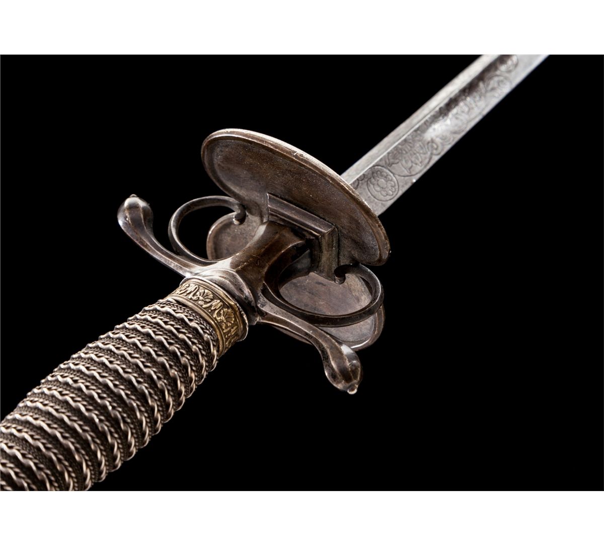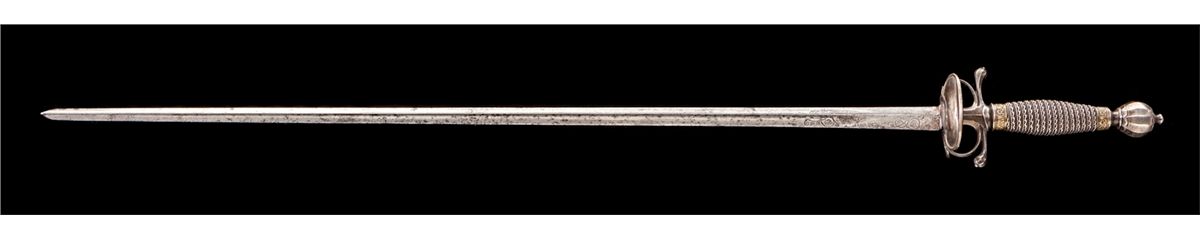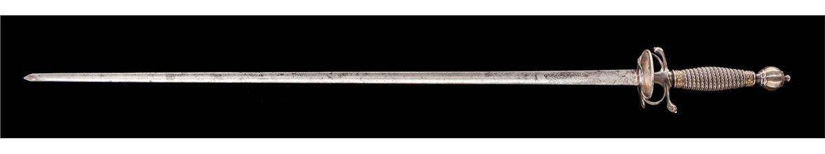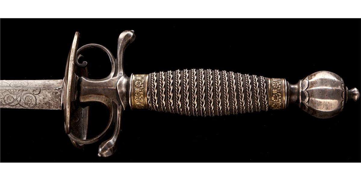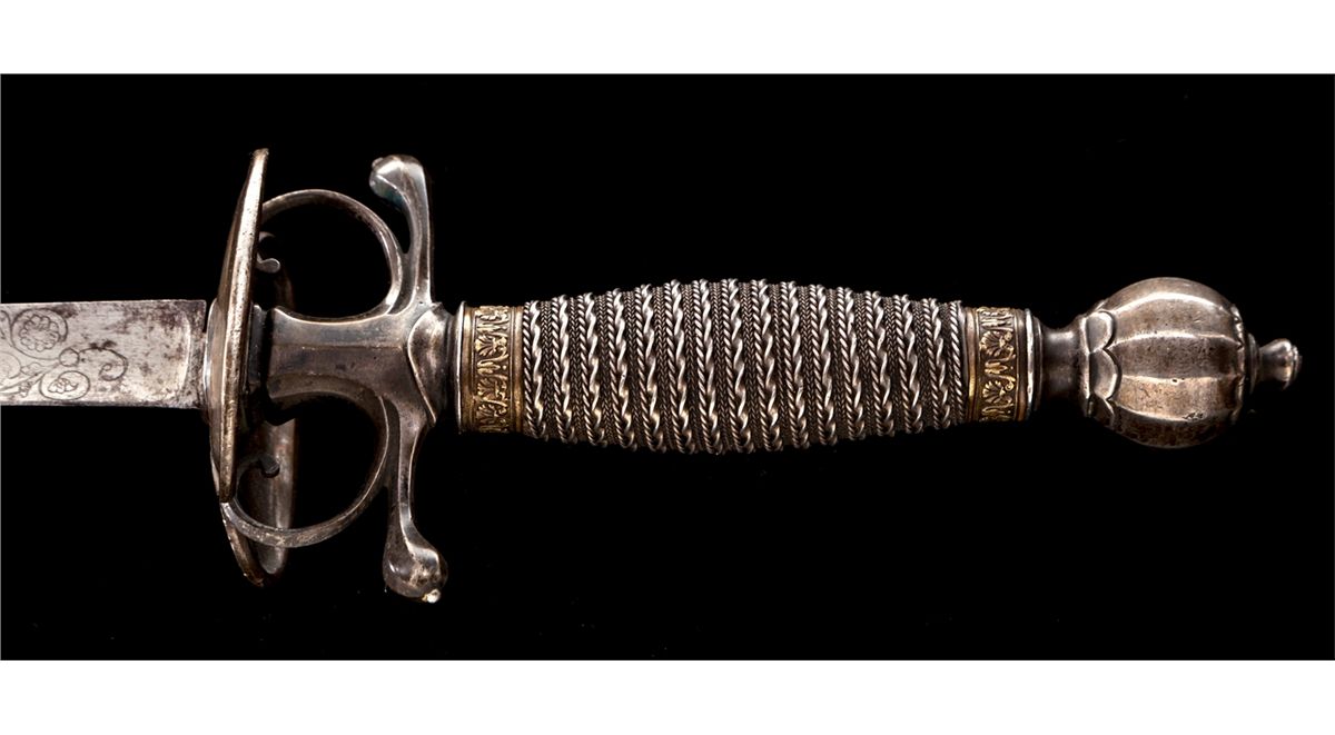 Late 18th Century Italian Pillow Sword, 27-1/2'' lightly etched triangular blade, silver hilt with double asymmetrical shell guard and short horizontal re-curved quillions. Globular silver pommel (sometimes referred to as a Turk's head) with small finial tip. Twist wire-wrapped grip with relief carved brass bands on top and bottom. Condition is fine with light carbon spotting to blade and minor tarnishing to silver components. Est.: $1,200-$1,800.