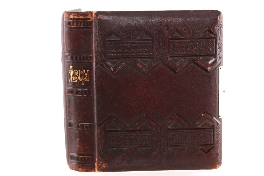 Featured in this lot is an antique leather bound cabinet card photo album. Elaborate, intricate, magnificent, from the Victorian era, mid to late 1800s. The carved leather bound cover features intricate designs on the front, spine and back. The album features a working metal lock to keep the album securely closed. The edge of each page is meticulously gilded, one of a kind and remain a fabulous souvenir book to cherish. The cover is in good condition, and the whole album is securely intact. Some of the pages have tears throughout, most likely from years of inserting and removing photographs. Foxing is evident on the pages. The album measures 10 3/4" L x 8 5/8" W x 2 1/2" D.