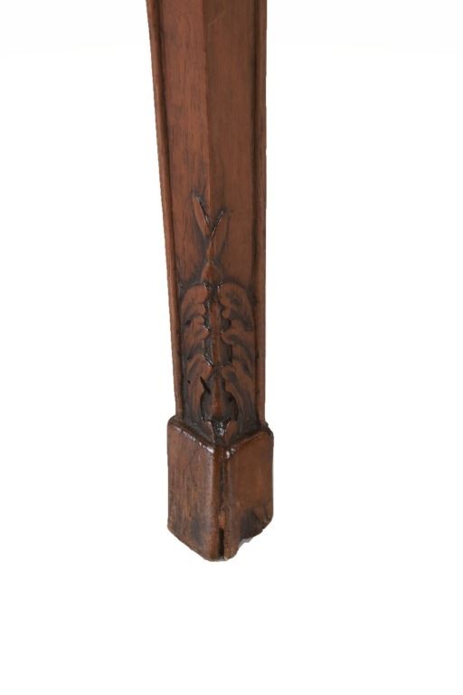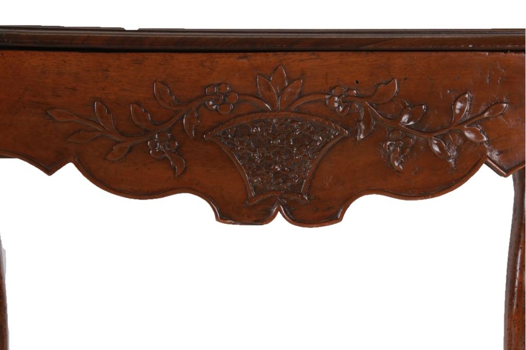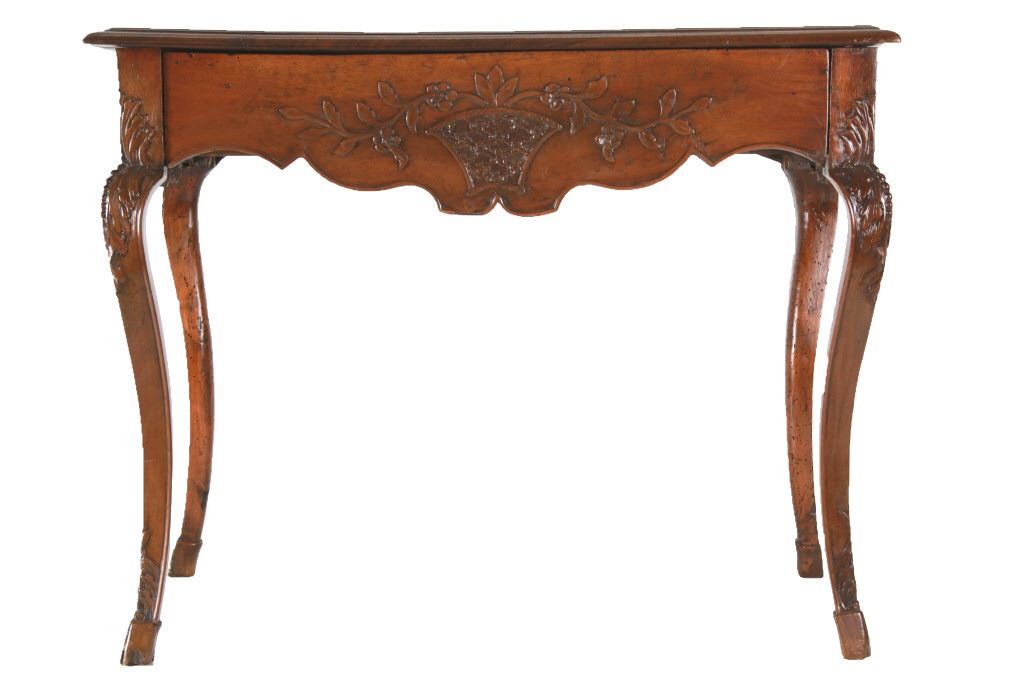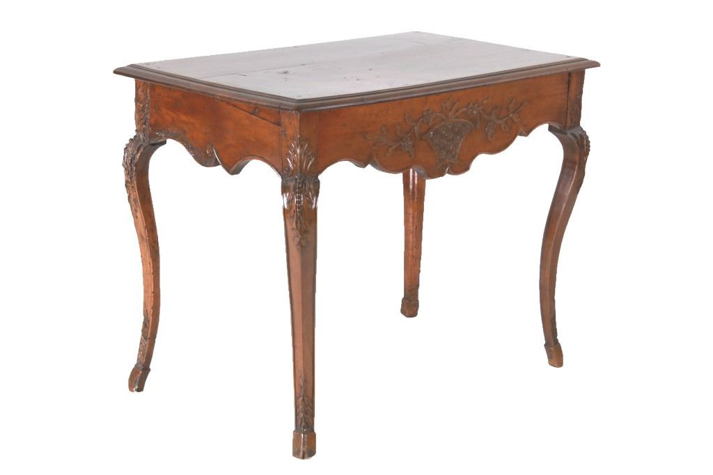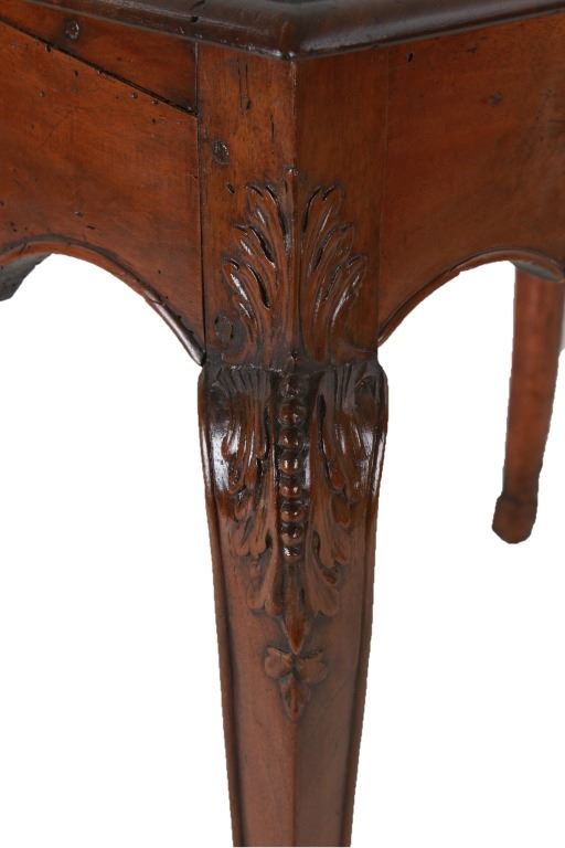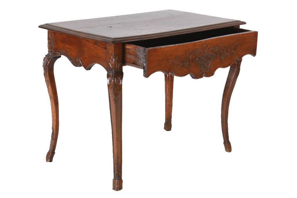Presented in this is a Late 18th Century Louis XV Writing or Side Table. Louis XV style is the epitome of French furniture at its finest. The eighteenth century is considered the Golden age of French furniture. It was during this time that the most refined and beautiful Royal furniture was made in the busy Paris workshops of Europe's elite cabinet makers. Rococo motifs are central to Louis XV furniture design. These include C-scrolls, S-scrolls, acanthus leaves, rocaille (shell-like) patterns, and pastoral scenes. These elements were used to create a sense of movement and natural beauty, often giving the furniture a light, almost whimsical appearance. The hand-carved walnut writing side table features a two-panel rectangular Dupont lip edge top, a single centre drawer integrated with the intricately carved front scalloped apron, carved side rails. Elegant cabriole legs feature hand carved acanthus leaves and vines at the feet and shoulders, carved shoulders flow into upper rails. This beautiful table is in very nice preserved condition, the natural condition of the wood is visible consistent with the nature-inspired focus of the Louis XV period. Measures 21.75"W x 34.5"L x 27.25"H and weighs 37 pounds.