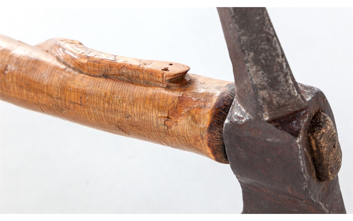 Late 18th Century Spiked War Tomahawk, hand-forged tapered blade, with hand-carved snake-wrapped hickory handle. Head measures 9-1/2'' in length, with spike portion tapering to a 5/16'' blunt tip. Integral snake wrapped three times terminating 1'' beneath head. Condition is fine with general carbon darkening to head and minor crazing to original finish of shaft. A beautiful example of a Revolutionary War period tomahawk, similar to those pictured in the book ''Battle Weapons of the American Revolution'', by George Neumann, and generally attributed to Great Lakes and Upper New York Native Americans. Est.: $5,000-$7,500.