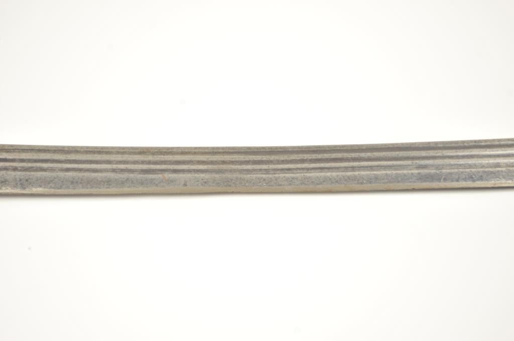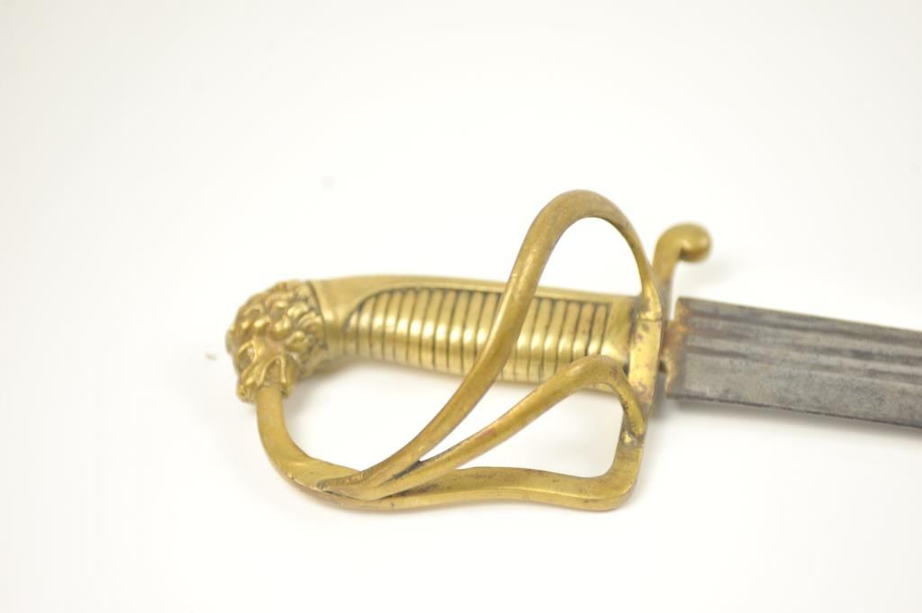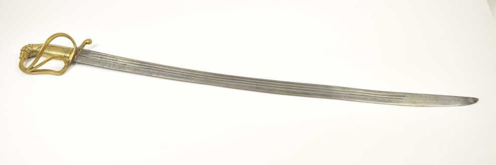 Late 18th to early 19th Century Sabre with cast brass hilt and lion head pommel. Period replaced blade showing three grooves that looks Spanish Colonial. Two crude branches period added to Guard. 37" overall, 32" blade measuring almost 1 1/2" wide at widest part. Blade almost strait with only slight curve and taper to point. Some minor pitting and about good overall. In our opinion this sword could be Mexican or Alamo era. Est:$350-700