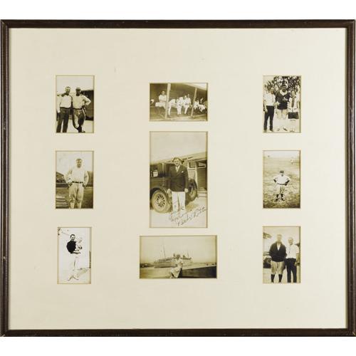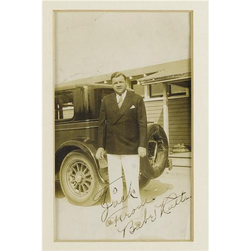 <B>Late 1920's Babe Ruth Signed Photograph with Unsigned Snapshots.</B></I> Exceptional one-of-a-kind image of the great Bambino posing in front of a car at the Yanks' Florida spring training grounds is simply inscribed in 8.5/10 ink, "To Jack, From Babe Ruth." This 3x5" image shows a few mild creases, but nothing that detracts from the visual appeal. The signed photo forms the center point of a great collage of eight other original snapshots, which include two more shots of the Babe, one of Lou Gehrig, another of hunchbacked bat boy Eddie Bennett, and various other unidentified Bronx Bombers. "Jack," the father of our consignor, poses with these greats in a few of the images. The unsigned snapshots appear to show no signs of damage, and offer a unique look at this historic baseball dynasty. The collage is matted and framed to final dimensions of 16.5x18.5".