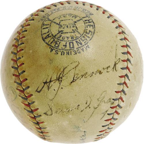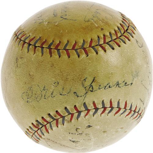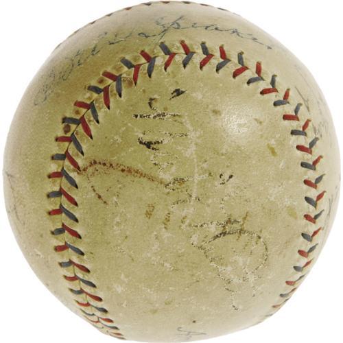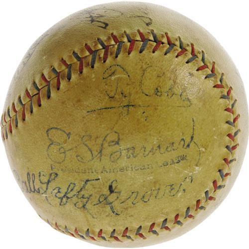 <B>Late 1920's Legends Signed Baseball with Ruth, Gehrig, Cobb, Speaker.</B></I> You couldn't ask for a better cast of characters than that which we find on this OAL (Barnard) baseball, likely signed at a meeting between the New York Yankees and the Philadelphia Athletics. Sam Gray is the only signer lacking a Cooperstown plaque, keeping fine company with Babe Ruth, Lou Gehrig, Ty Cobb, Tris Speaker, Lefty Grove and Herb Pennock. While the passing years have had an effect on these historic playing-days signatures, it must be noted that all remain legible and absolutely unmistakable. Ruth rates lowest at 3/10, with his Yankee partner Gehrig a couple points better at 5/10. Their teammate Pennock rates a nice 7/10, as do Cobb, Grove and Speaker, raising the overall average considerably. Careful curation and storage of this important baseball artifact will ensure that it remains in its present state for future generations of collectors, and that it will continue to increase in value as all pieces blessed by such an array of baseball gods do. <I>LOA from PSA/DNA. LOA from James Spence Authentication.</B></I><BR><BR><b>Shipping:</b> Balls, etc. (<a target="_blank" href="http://www.heritageauctions.com/common/shipping.php">view shipping information</a>)