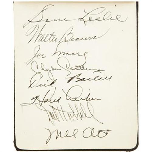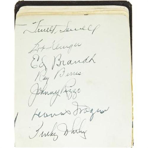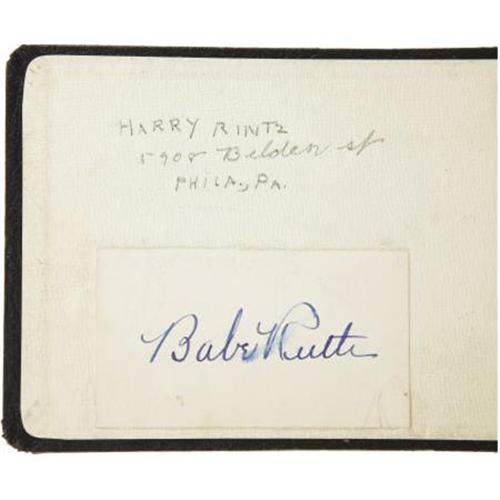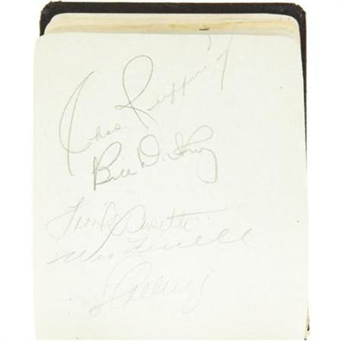 <B>Late 1930's Autograph Book Signed by Babe Ruth, Gehrig, Ott & More.</B></I> Just short of two hundred signatures comprise this youthful project of an avid Philadelphia baseball fan, who sought out a sizeable contingent of legends and lesser-knowns to fill the pages of his autograph book. Beginning at the first page and continuing on, we encounter such names as Ruth (small smear, otherwise 9+/10), Chuck Klein (8/10), Cuyler (9/10 pencil), Averill, Feller, Wagner, Traynor, Hubbell, Ott, Combs (9+/10 pencil), Ruffing (9+/10 pencil), Dickey (9+/10 pencil), Gehrig (9/10 pencil), Gomez (9+/10 pencil), Mrs. Franklin D. Roosevelt (9+/10 pencil), Joe DiMaggio (9+/10 pencil), Greenberg (9+/10 pencil), Gehringer (9+/10 pencil), Mize (9+/10 pencil), Slaughter (9/10 pencil). Unless otherwise noted, all are in 9/10 or better ink. A wonderfully evocative archive of the prewar game. <I>LOA from PSA/DNA. LOA from James Spence Authentication.</B></I><BR><BR><b>Shipping:</b> Books & Catalogs (<a target="_blank" href="http://www.heritageauctions.com/common/shipping.php">view shipping information</a>)