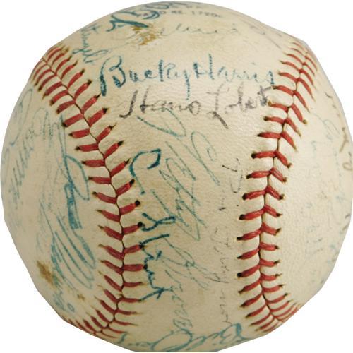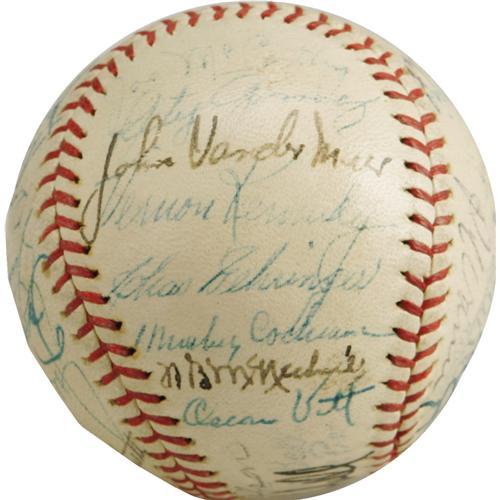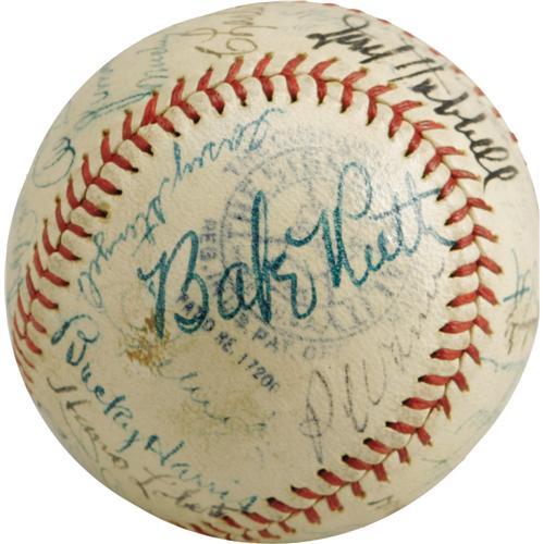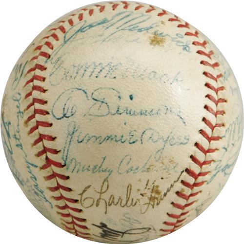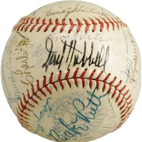 <B>Late 1930's Hall of Famers Multi-Signed Baseball with Ruth, Gehrig, Foxx.</B></I> A dazzling constellation of stars makes this OAL (Harridge) ball one of the most intriguing autographed pieces within this auction. Twenty-seven of the thirty-five gentlemen to have made their mark on this historic sphere are enshrined at Cooperstown, making this quite possibly the largest compilation of pre-war Hall of Famers ever seen on a single baseball. The thrilling relic derives from the estate of Ed Gilliland, general manager of the St. Louis Browns and remains in stunning condition, with all autographs (unless otherwise noted) projecting at a strength of 7/10 at a minimum. And so, without further delay, the cast of characters: Ruth, Gehrig (5/10), Paul Waner, Stengel, Harris, Traynor (6/10), Grove, Hartnett, Cronin, Frisch, Foxx, Feller, Dickey (6/10), Grimes, Greenberg, Terry, Medwick, DiMaggio (2/10), Mack, Simmons, Cochrane, Hubbell, McCarthy (6/10), Gomez (6/10), Gehringer, Cochrane, McKechnie, Lobert, Street, Grimm, Jim Wilson, VanderMeer, Vernon Kennedy and Vitt. We must also note that Grimes, Terry, Medwick, Frisch and McCarthy are secretarially signed. A piece for the most discerning of collectors, or for those who wish to kill a large flock of birds with a single stone. This single purchase will result in one heck of an autograph collection. <I>LOA from PSA/DNA. LOA from James Spence Authentication.</B></I><BR><BR><b>Shipping:</b> Balls, Pucks, etc., Small (<a target="_blank" href="http://www.heritageauctions.com/common/shipping.php">view shipping information</a>)