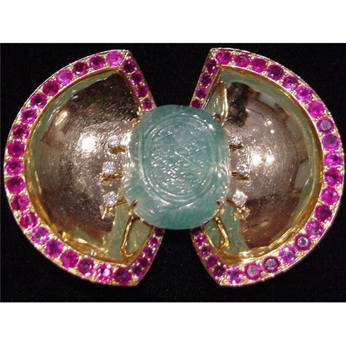 Fabulous Circa 1930s 14Kt yellow gold (heavy) Large carved Emerald accented with 6 full cut diamonds and numerous rubies (measurements and carat weight estimates to follow) in a stylized abstract form. Very very heavy. Wonderful stones. Highly unusual. Fantastic piece.