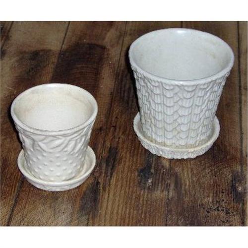 This set of beige-white colored flower pots is early McCoy ware from the late 1930s-1940s. Each has a textured design and attached saucer.</em></td>