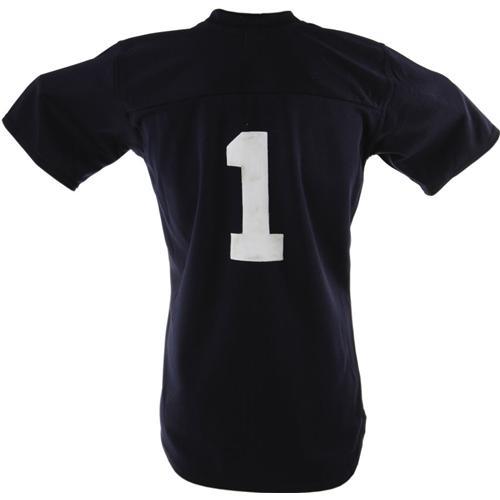 <B>Late 1980's Billy Martin Game Worn Batting Practice Jersey.</B></I> Navy blue New York Yankees pullover was sported by the troubled manager during his fifth and final tour of duty under George Steinbrenner's tyrannical reign. Classic "NY" logo appears on chest in clay-stained white tackle twill, matching the number "1" affixed to verso. "Majestic size L" tag inside collar shows nice wear. Acquired from the Yanks' official marketing company, "Yankees-Steiner Collectibles," with their letter of authenticity. <I>LOA from Lou Lampson.</B></I><BR><BR><b>Shipping:</b> Clothing, Costumes & Jerseys (<a target="_blank" href="http://www.heritageauctions.com/common/shipping.php">view shipping information</a>)