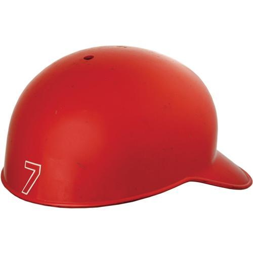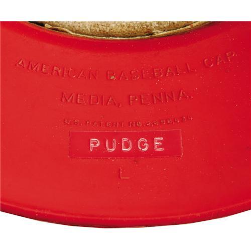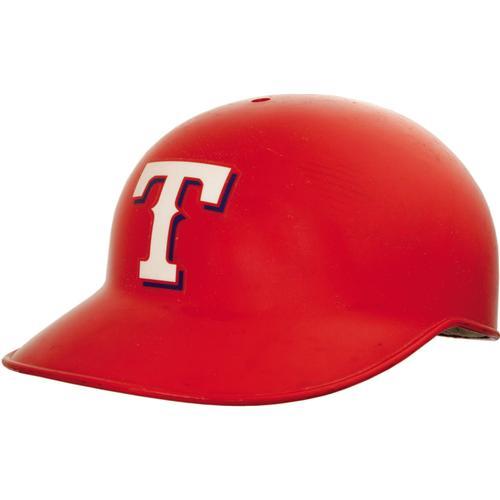 <B>Late 1990's Ivan Rodriguez Game Worn Catcher's Helmet.</B></I> A fearsome sight to all opposing baserunners, as nobody in the game is more adept at sending prospective base thieves back to their dugouts. Red protective helmet from "American Baseball Cap" exhibits excellent wear, with "Pudge" spelled in dymo tape under visor. Team logo "T" above brim, with number "7" decal affixed to verso. Size "L." Catcher's gear is always tough, particularly from Hall of Fame caliber backstops. <I>LOA from Lou Lampson.</B></I><BR><BR><b>Shipping:</b> Miscellaneous Collectibles, Larg (<a target="_blank" href="http://www.heritageauctions.com/common/shipping.php">view shipping information</a>)