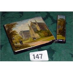 Late 19c papier mache card case with painted scene of Oxford college to facing side gilded and inlaid decoration to reverse (some damage) 3" x 4"