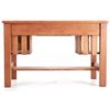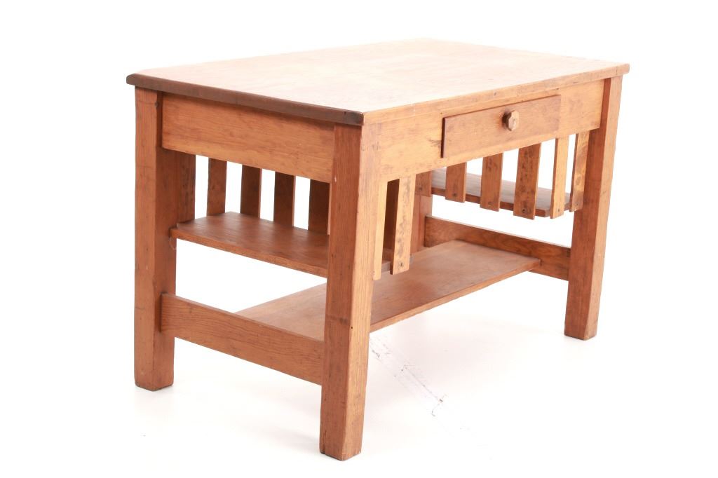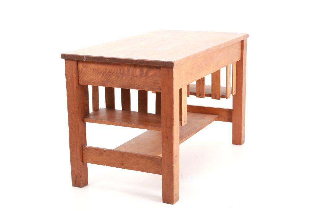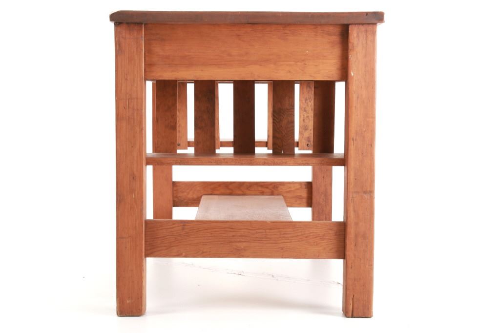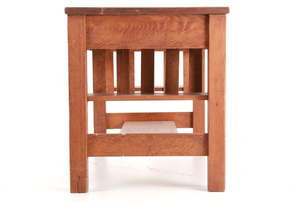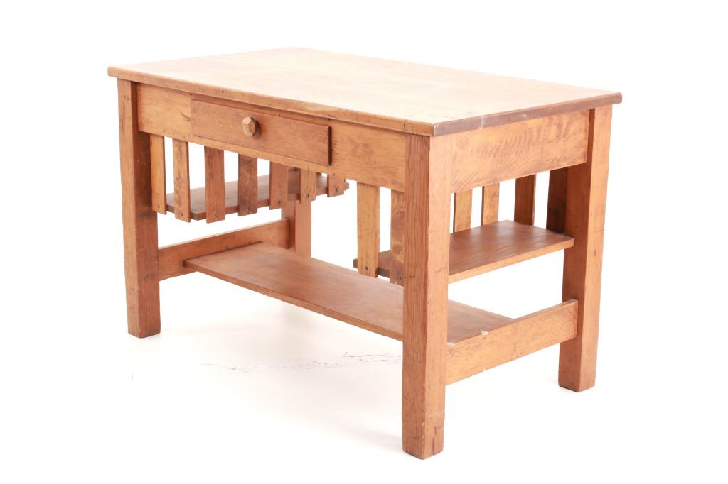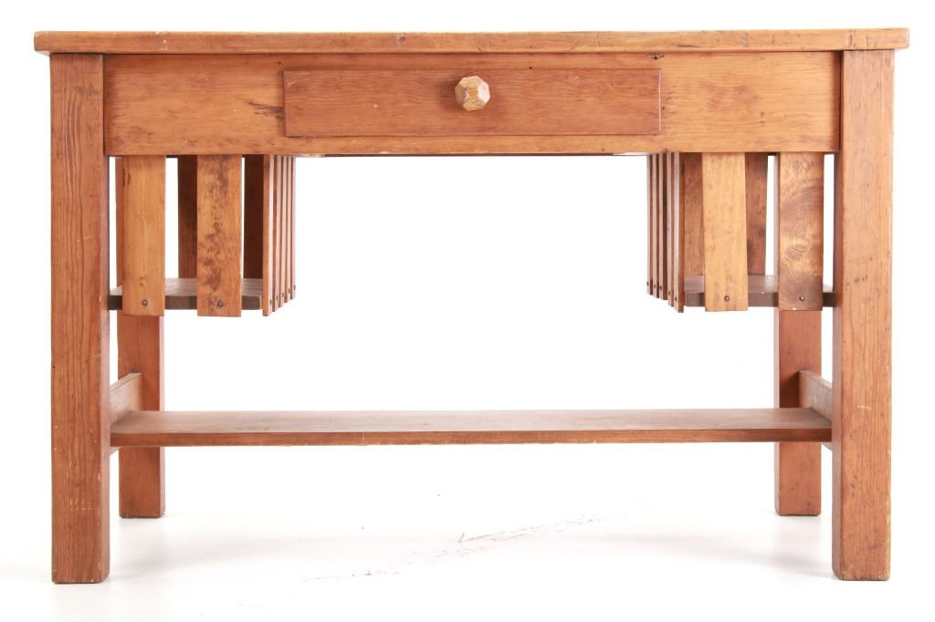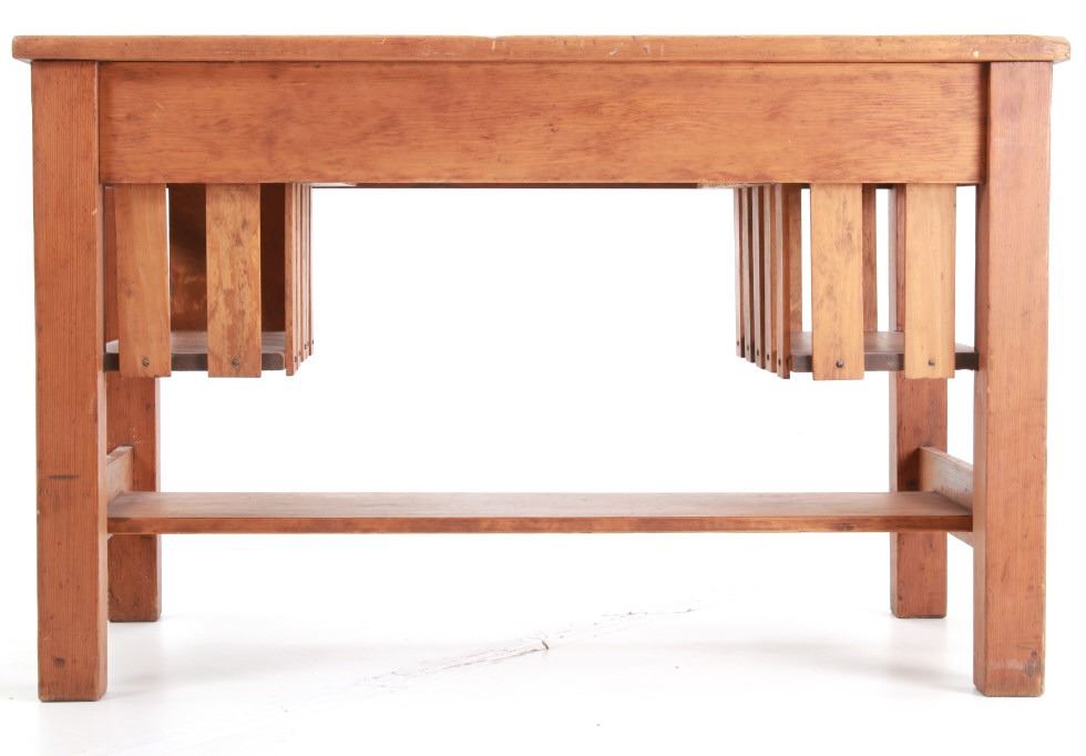 Available for your bidding pleasure is this Late 19th/20th C. Arts and Crafts period Mission Style Desk. This desk shows a solid pine wood construction with excellent design. The desk features a pull out drawer, on either side of the desk are two shelves which offer added storage. Each side of the desk shows two slats which disguise shelving which is accessible from either side. Visually, Arts and Crafts furniture and Mission style furniture are one and the same, with straightforward wood forms, becoming quite popular in the United States at the turn of the century, where it took on the name "Craftsman style" (you're probably familiar with Craftsman bungalows). But colloquially, both Arts and Crafts and Craftsman are used interchangeably when referring to the American movement. When it comes Arts and Crafts furniture specifically, the aesthetic is simple. Pieces were often made out of stained wood, featuring straightforward rectilinear forms with little to no ornamentation. The focus was on the solid craftsmanship rather than the design, promoting the humility and integrity of labor. Gustav Stickley was a major proponent of the style, producing countless pieces of Arts and Crafts furniture.