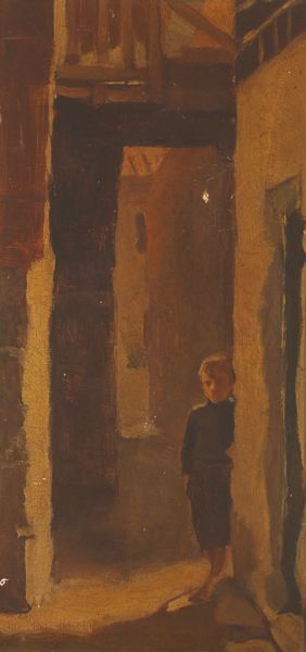 Late 19th / 20th Century Irish & British SchoolSTUDY OF A YOUNG BOY LEANING AGAINST A WALL FRAMED BY WOODEN EAVES ABOVE AND STREET BEYOND oil on canvaswith faint indistinct inscriptions on reverse; with label of frame manufacturer [Bayswater, W., and [?] Street Kensington] also on reverse168 -