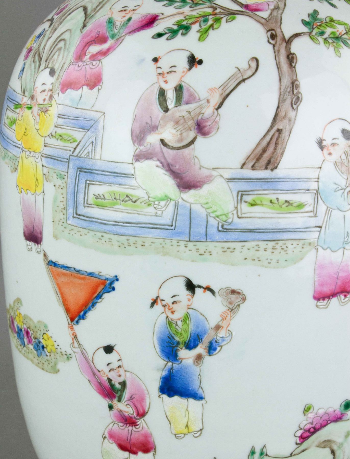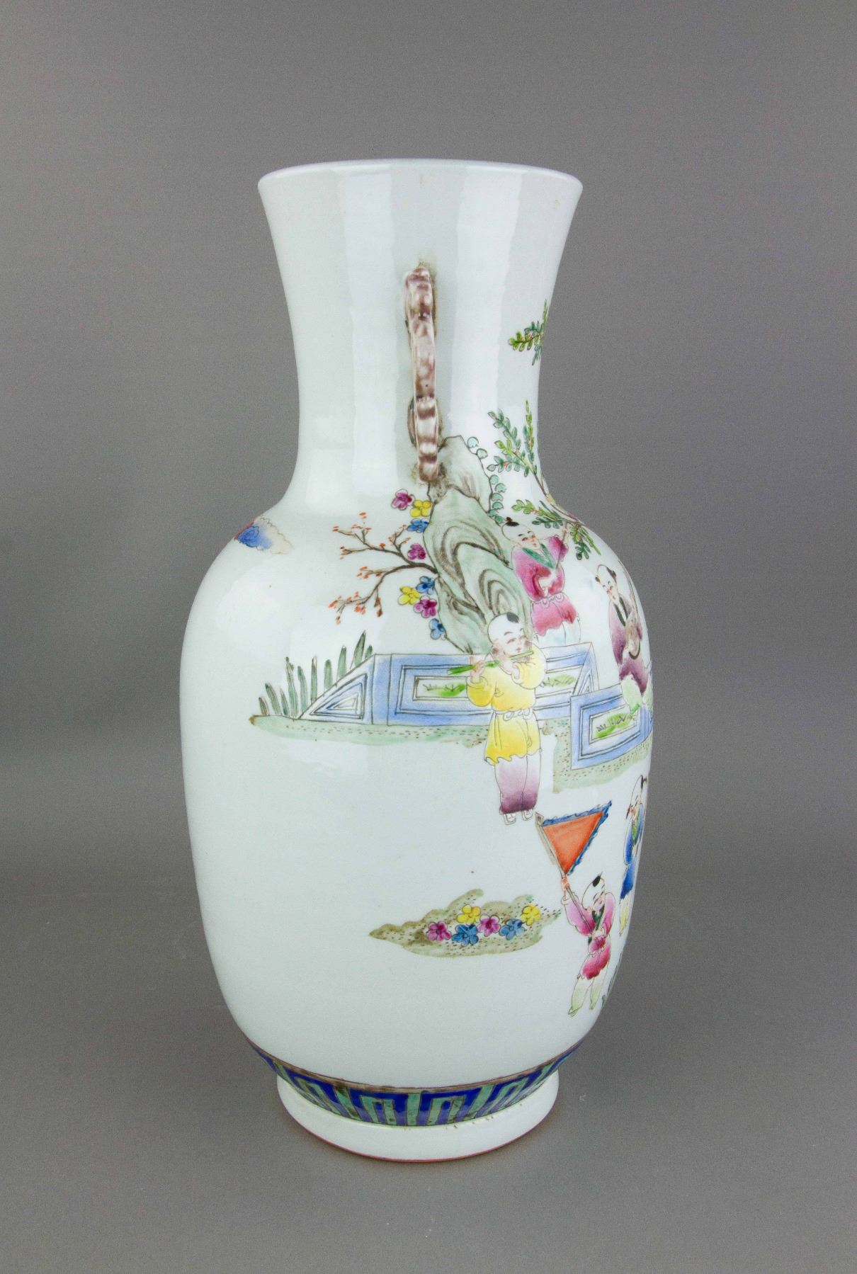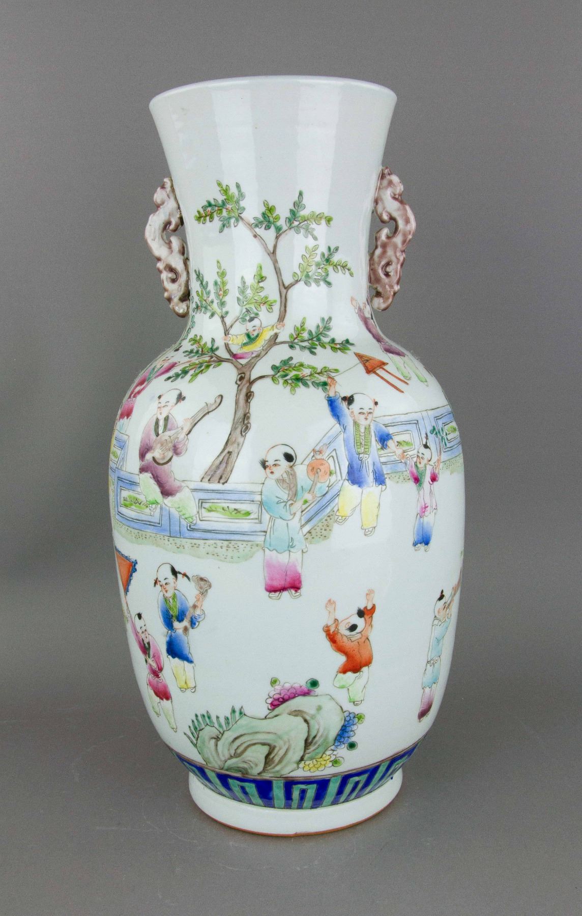 Chinese Famille Rose porcelain vase; of ovoid body with splayed neck; flanked by double chilong-shaped handles; painted with children at leisure time; six-character Daoguang mark on base; H:42 cm, D: 20 cm, 3567 grams. Late 19th Century. PROVENANCE: Private collector (Nagoya, Japan)