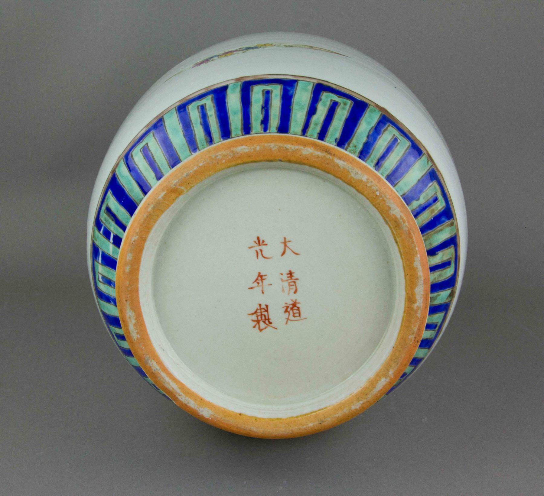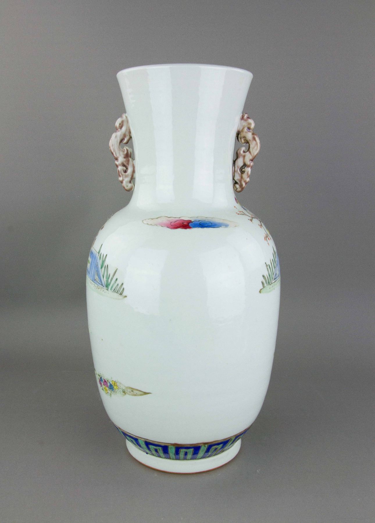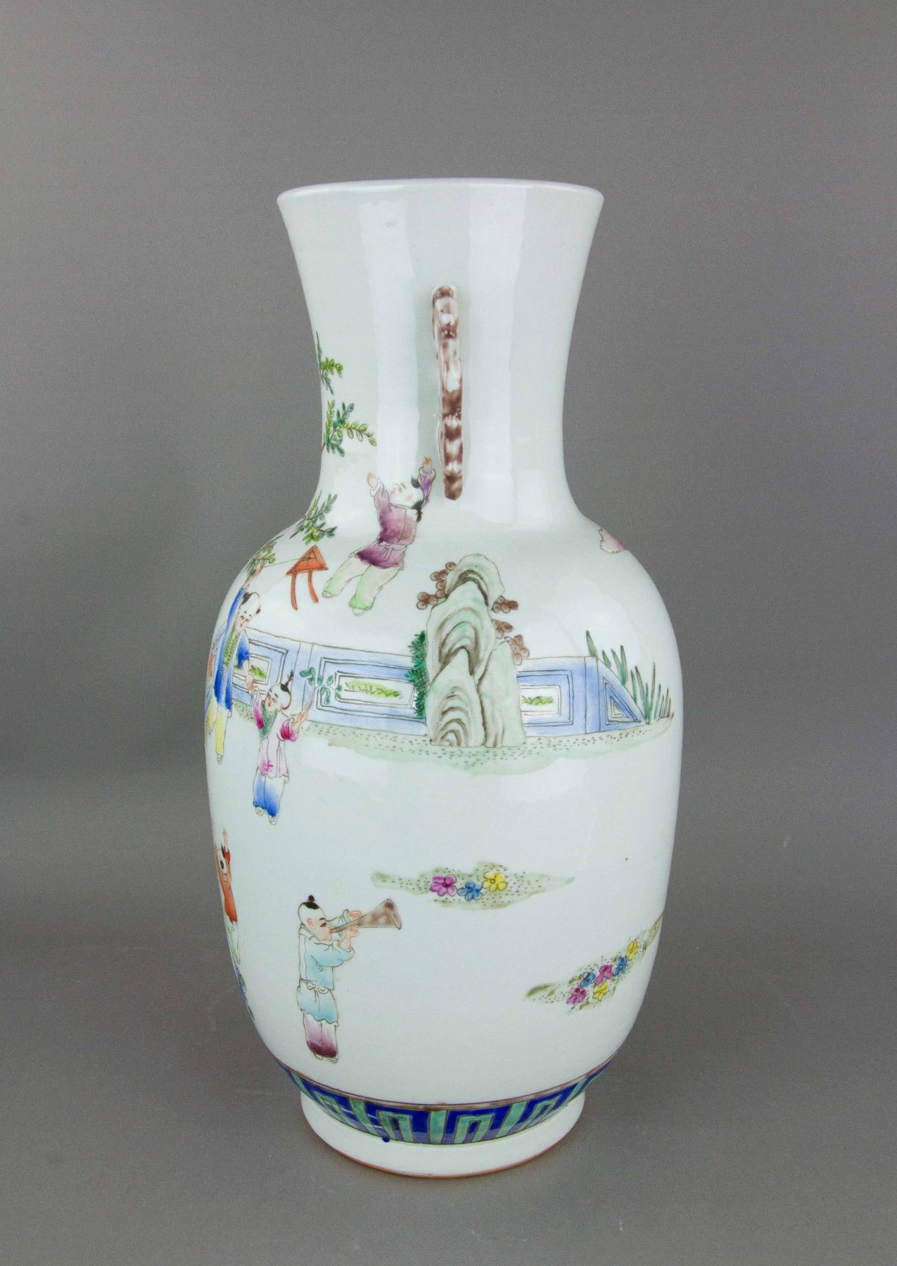 Chinese Famille Rose porcelain vase; of ovoid body with splayed neck; flanked by double chilong-shaped handles; painted with children at leisure time; six-character Daoguang mark on base; H:42 cm, D: 20 cm, 3567 grams. Late 19th Century. PROVENANCE: Private collector (Nagoya, Japan)