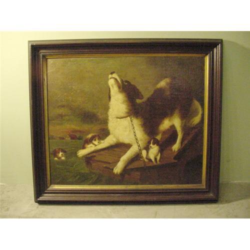 Late 19th C. French, Painting widely held theme of Dog & her Puppies surviving a flood