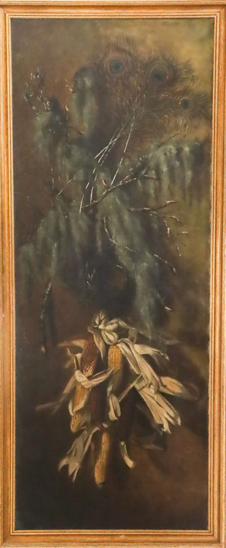 This piece depicts a scene decorated with corn shucks, branches, and peacock feathers. Oil on canvas