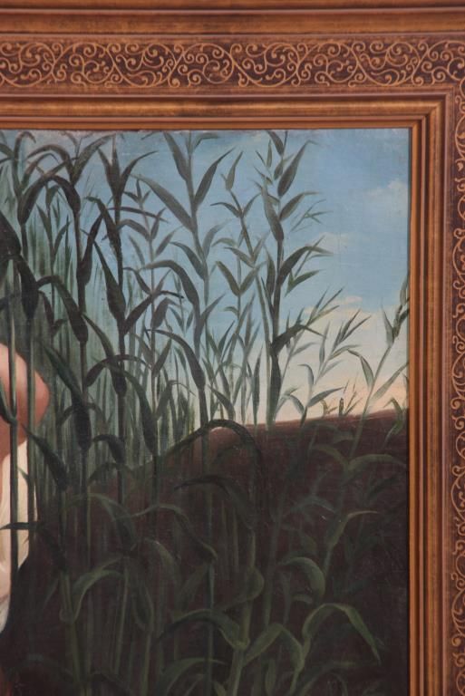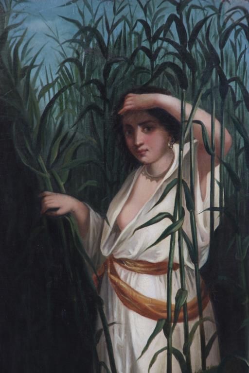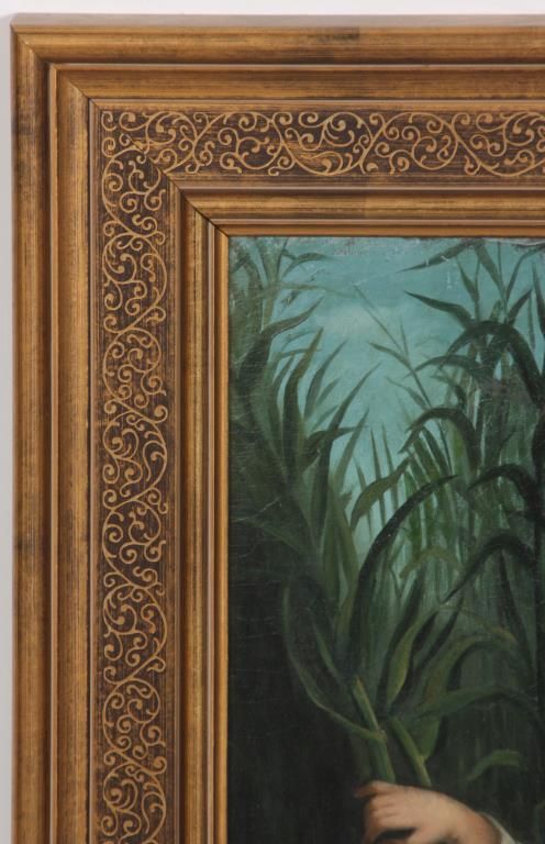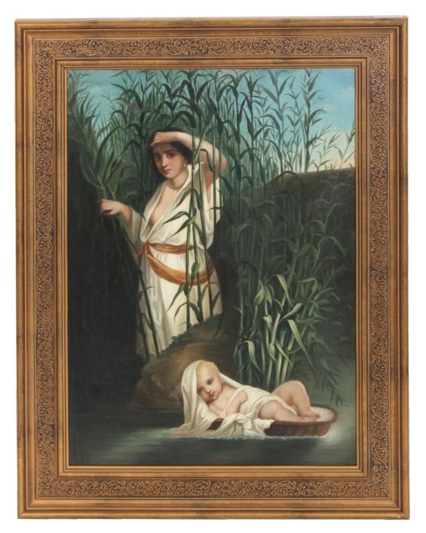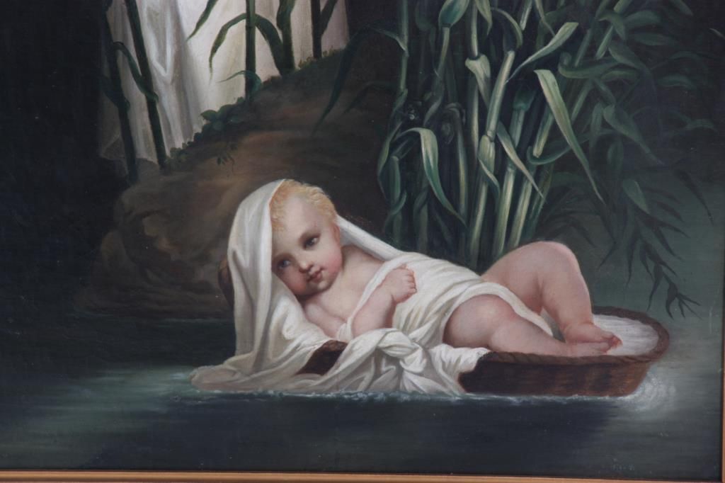 Late 19th C. O/C Painting Moses In The Reeds. The scene depicts the young servant of the pharaohs daughter peering through the tall reeds as she is searching for the baby Moses, floating in the river in a wicker basket. Canvas is relined, has a patch near the top in the reeds and a repair across the lower left section; has some inpainting. 25 in. high x 17.75 in. wide.