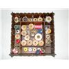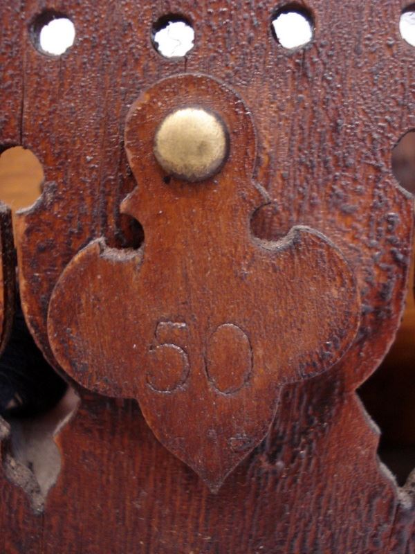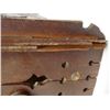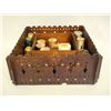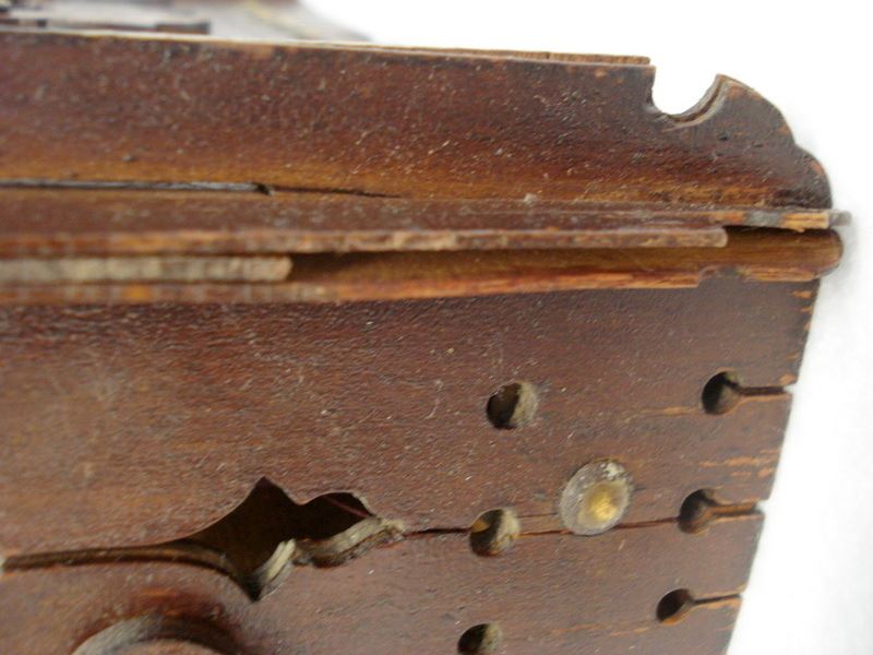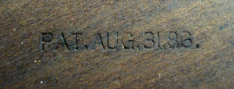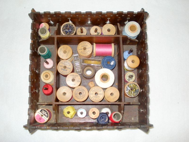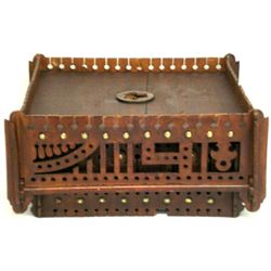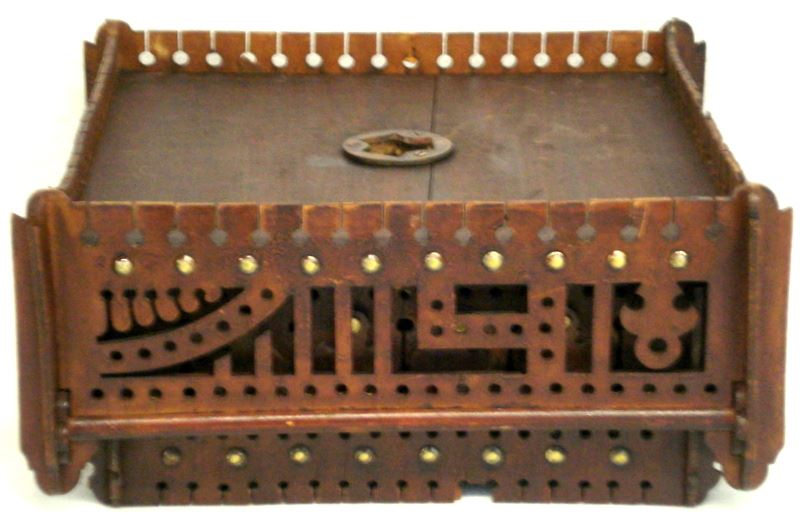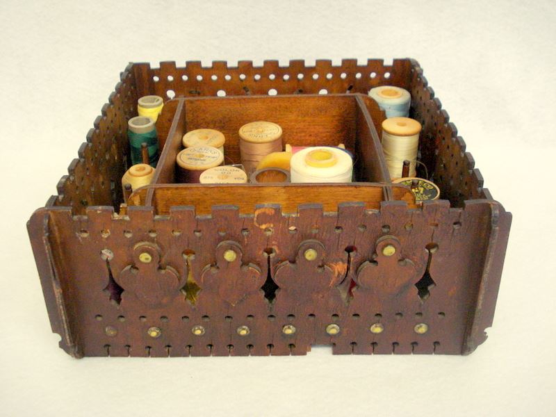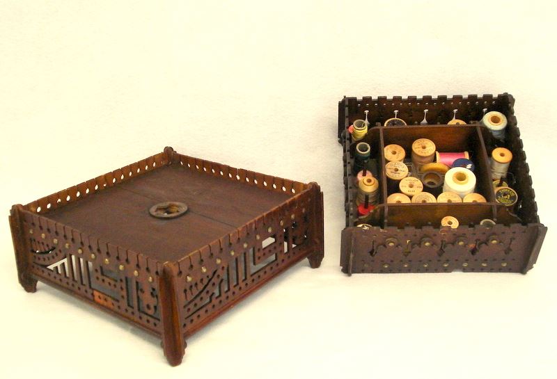 Late 19th C two part fretwork sewing box, with center section used for miscellaneous spools and items, and four surrounding sections holding spools with slotted windows to allow use of twist. Stamped patent date of Aug. 31,86 on top. Missing attached pin cushion. Several sections with minor losses to fretwork.