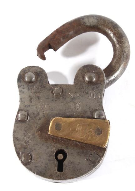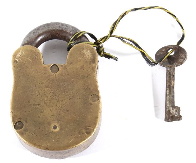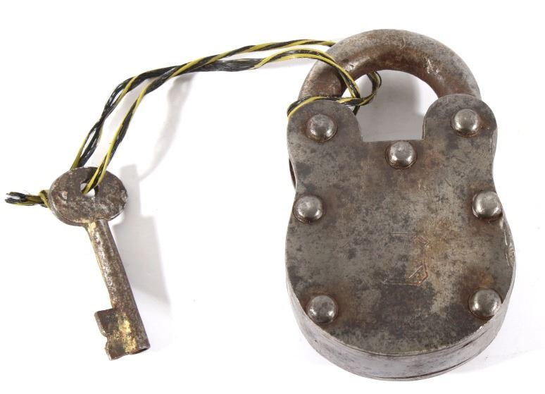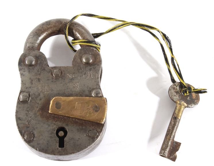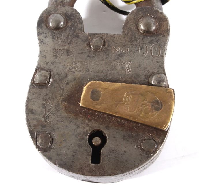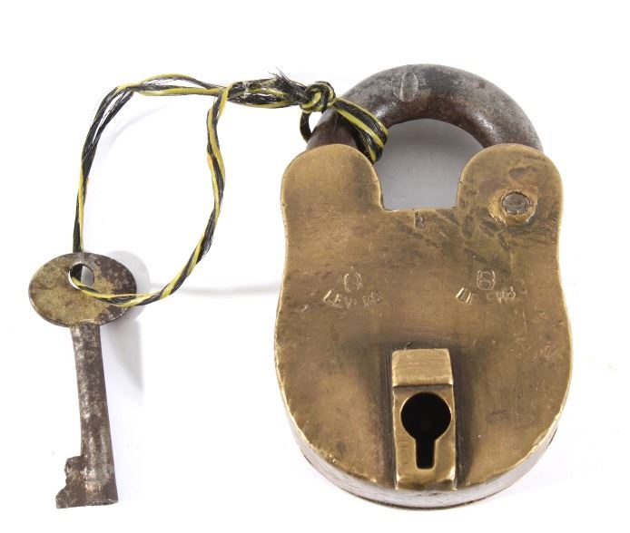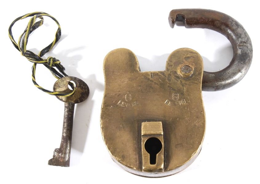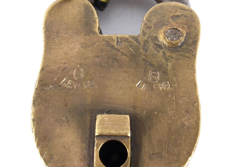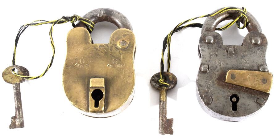 Included in this lot we have a pair of steel and brass vintage locks originating from the late 19th century. The first of the locks is made of brass body with a steel lever. The piece is marked across the front twice reading "6 Levers". The second lock shows steel construction with a brass front. The front of the lock is marked in faded lettering "No100 Bank Lock Specialty" with the back reading "Specialty lock". The lock shows their original keys and shows good condition overall with some dents and wear. The locks measures 4" tall by 2 1/2" wide and 1" thick.