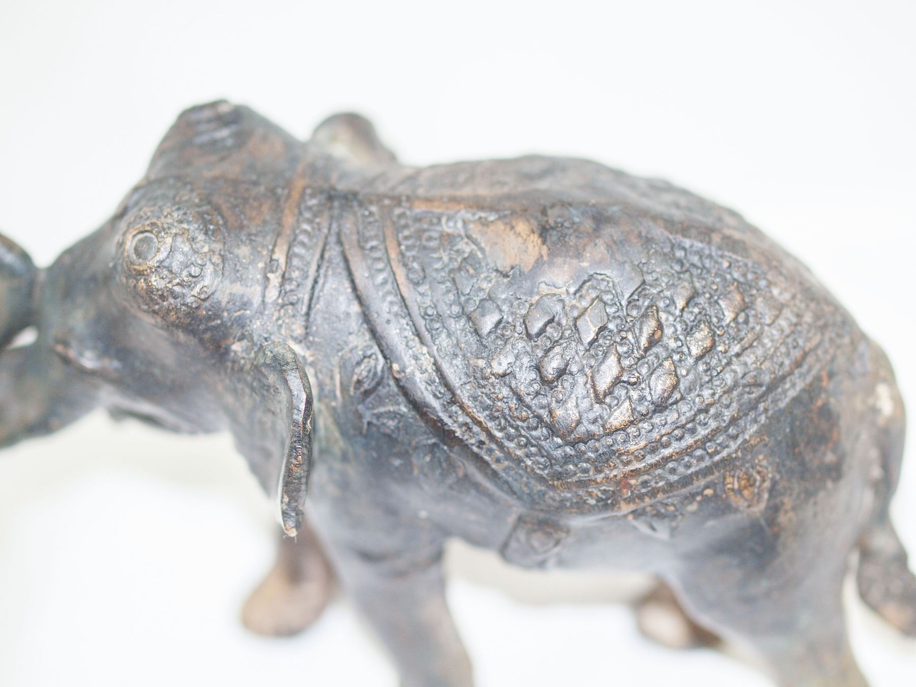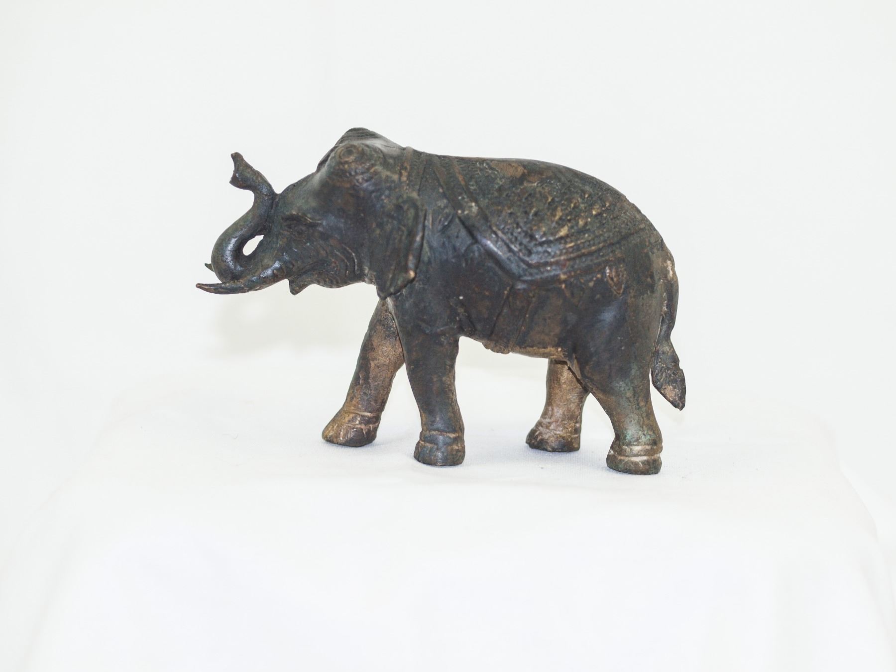 Late 19th century Indian bronze figure featuring elephant. “Lost-wax” casting of the elephant figure features evidence gilt gold, with some remaining parts of gold still remaining on the foil in the stomach and in some parts of paws. Restoration of teeth. 18 x 12 x 9 cm (7.1 x 4.72 x 3.54 inches), 1.16 kg. PROVENANCE: Private collection, Italy