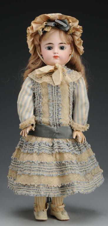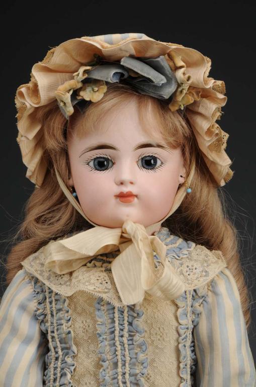 Description French bisque doll with head incised "9F.G.(within a scroll)", large blue glass paperweight eyes, closed mouth, highlighted nostrils, and original French fully-jointed wood and composition body with straight wrists. Wears a newer blonde mohair wig over a composition pate and has been redressed well. Top of head is slightly warped in the mold. Condition (Very Good). Size 21" T.