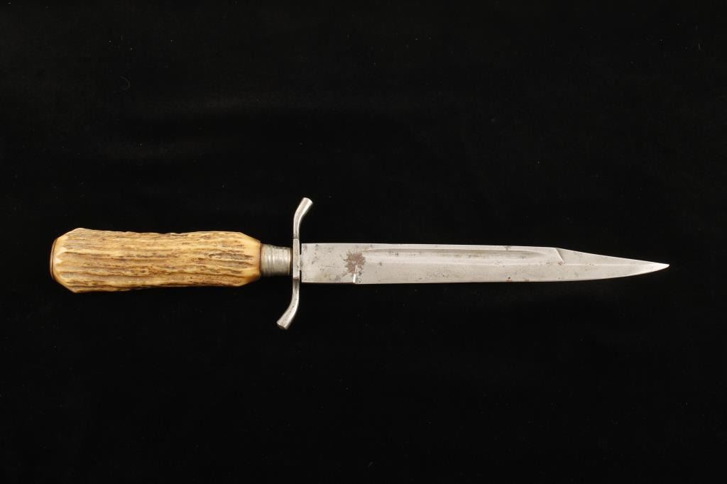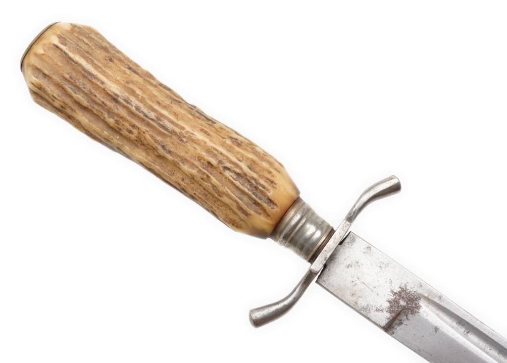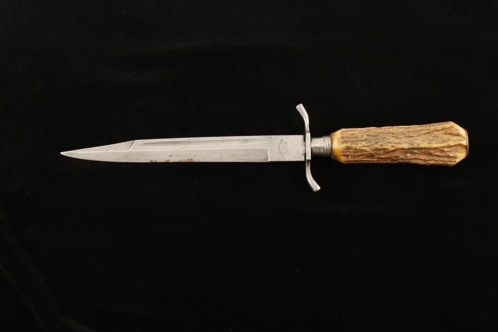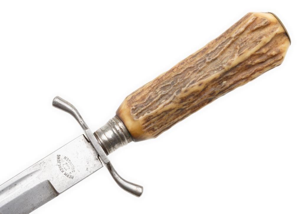 Late 19th Century German hunting knife, approximately 13.5” overall with an 8.5” blade marked “HERM. KONEJUNG/SOLINGEN”; overall good condition with stag grip and some scattered spots of erosion on blade.Est.: $150-$300.