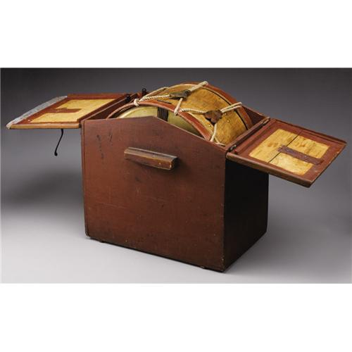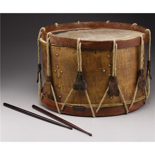 <B>Late 19th Century Hand-Made Drum.</B></I> This wooden drum is a nice display piece with tension ropes and tacked sides. The heads have come loose from the shell of the drum, and there is a 6” tear along the edge of the top head. The snares are intact along the bottom head. The drum comes in a custom-made wooden box with a pair of mahogany drumsticks that are of 20th century construction.<BR><BR><b>Shipping:</b> Other (oversized items, group lo (<a target="_blank" href="http://www.heritageauctions.com/common/shipping.php">view shipping information</a>)