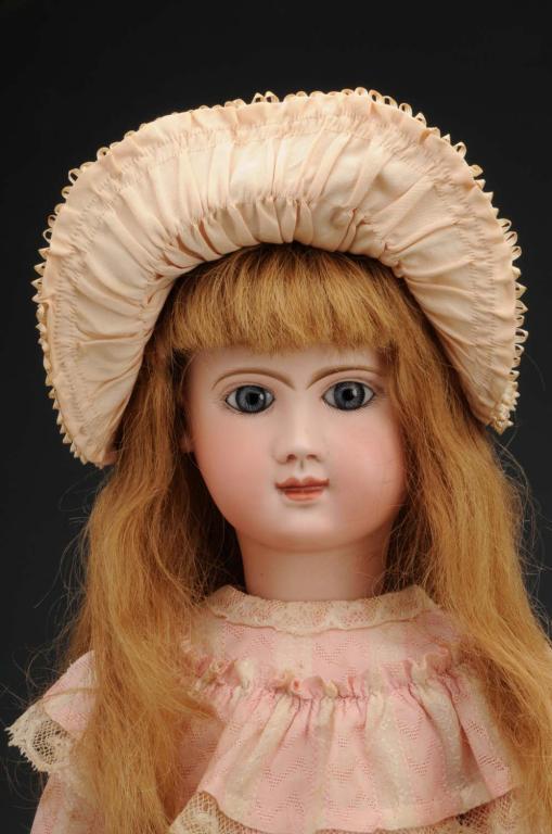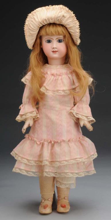 Description Closed mouth French doll with gray/blue paperweight eyes and stamped in red on back of head "Phenix" and "*95". Original five-piece French composition body jointed at shoulders and hips and auburn human hair wig over a cork pate. Appropriately redressed in the style of an 1890s child wearing antique pink silk shoes with cardboard soles and pom-poms. Slight, typical body wear with one slight scratch on back of neck. Condition (Excellent). Size 25" T.