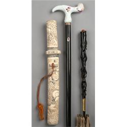 Late 19th Century silk parasol with gilt metal band engraved Dupuy, and having a finely carved to...