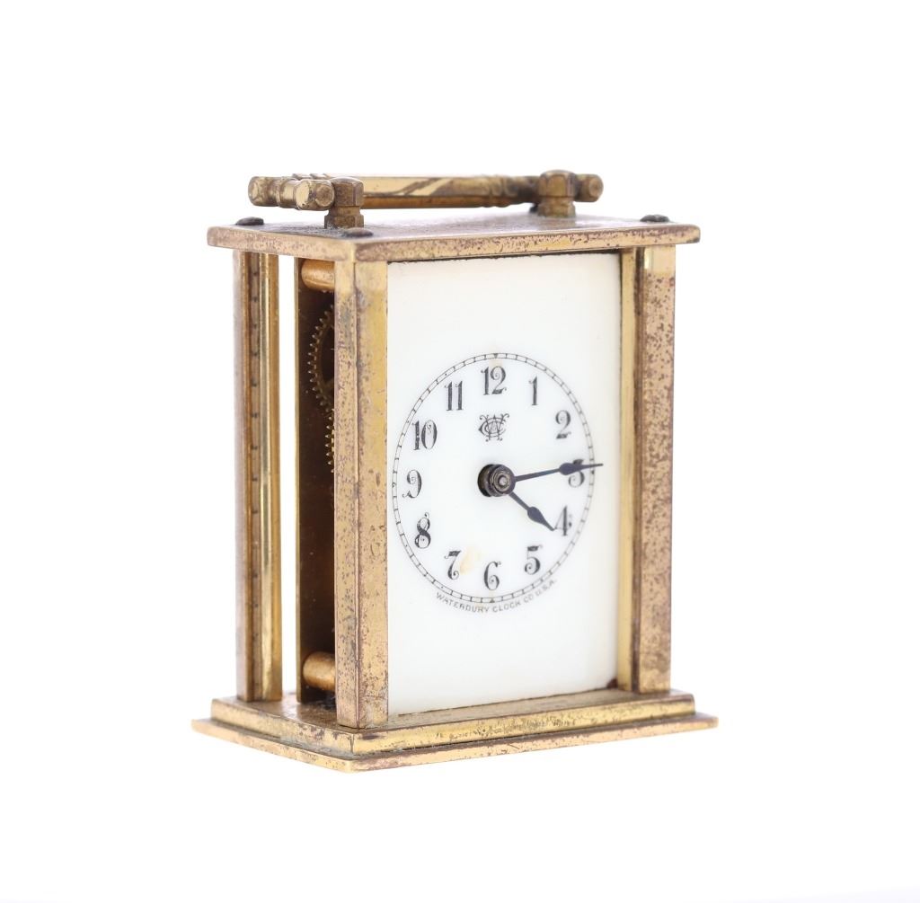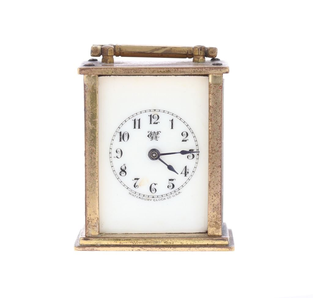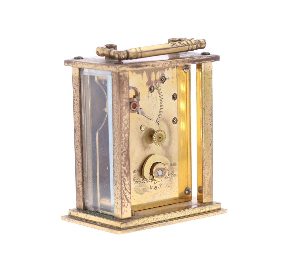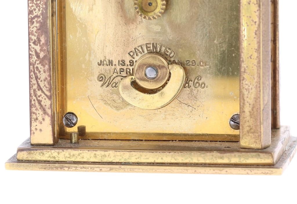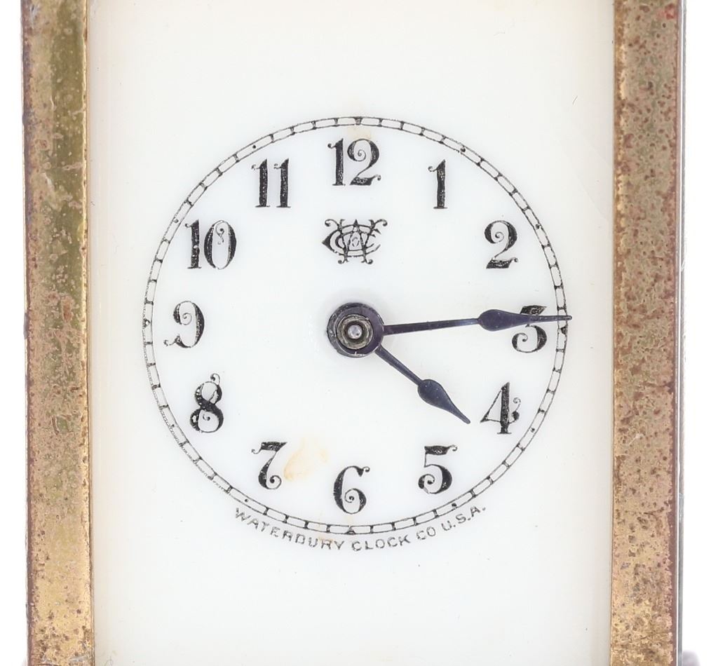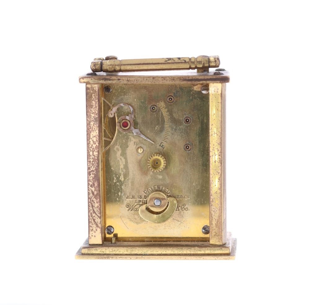 This is an original circa 1890-1920’s Waterbury Clock Co. brass carriage clock in a unique small size. The clock face is marked WATERBURY CLOCK CO. U.S.A. and on the back with the company name and shows patent dates in the 1890’s and 1901. This is truly a wonderful piece that is well kept and highly collectible. The clock has some patina and unknown working conditions. The measurements of this barometer is 2" x 1-3/8" x 2-7/16". The collective weight of this barometer is 6oz. Has beveled glass on one side, not the other or front.