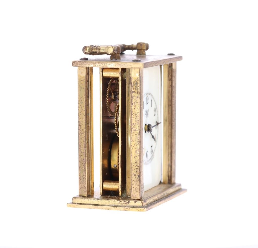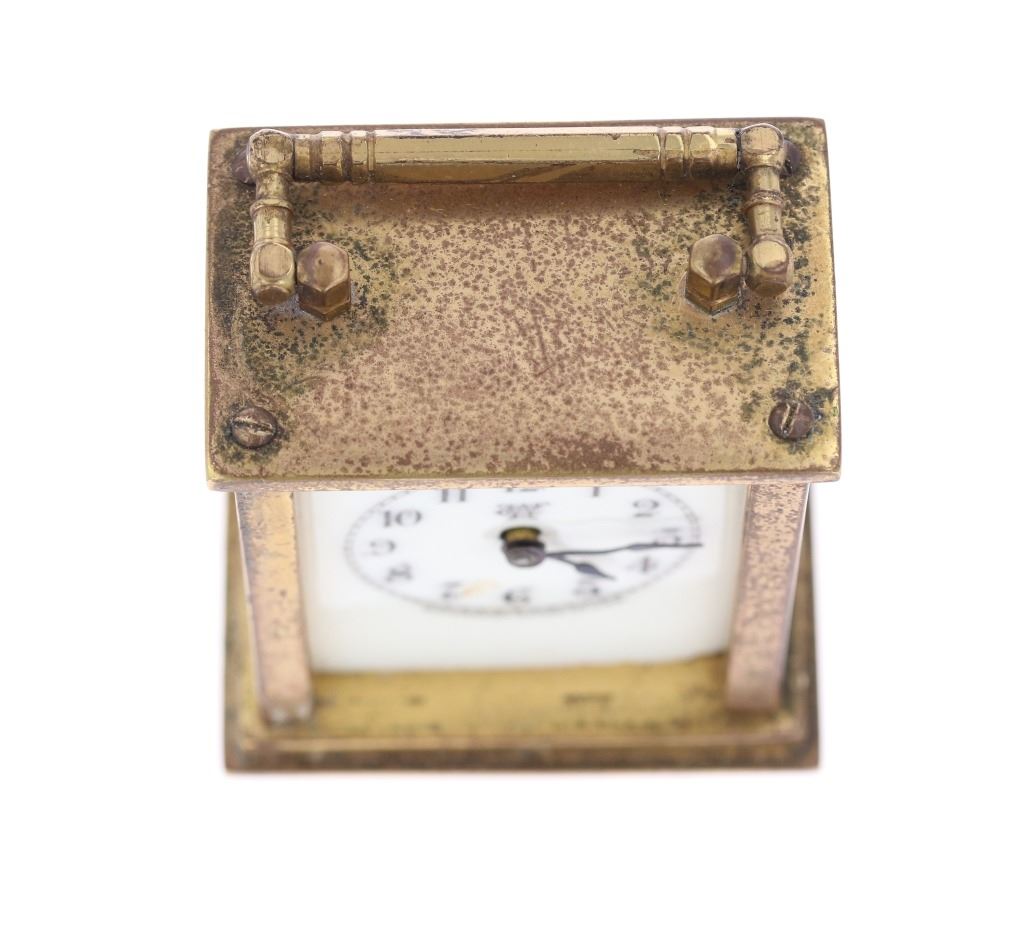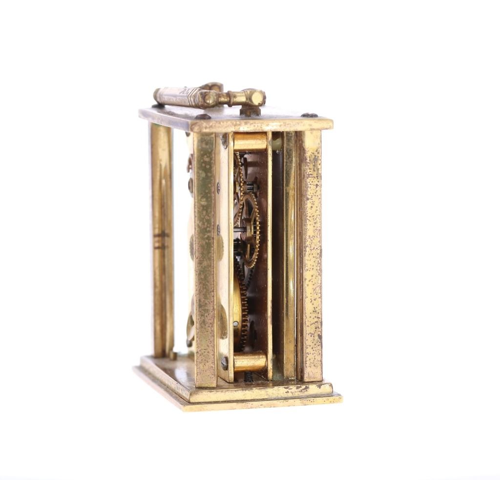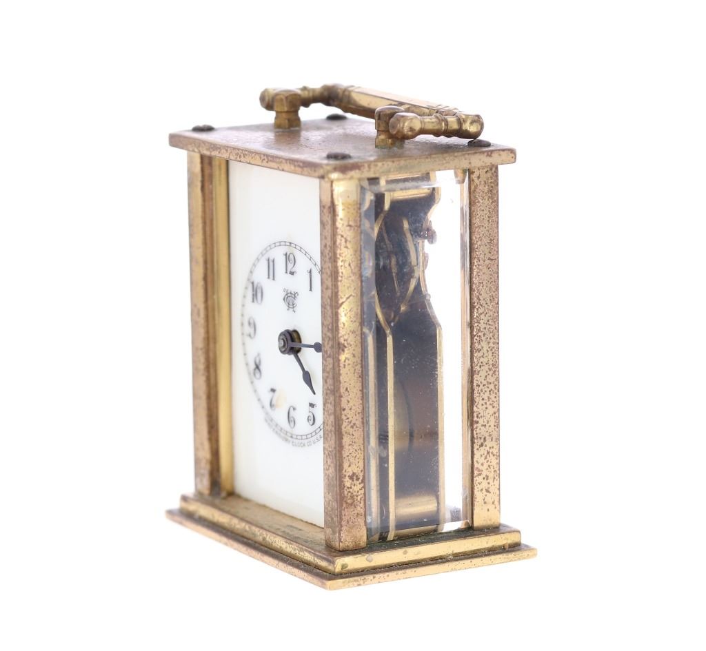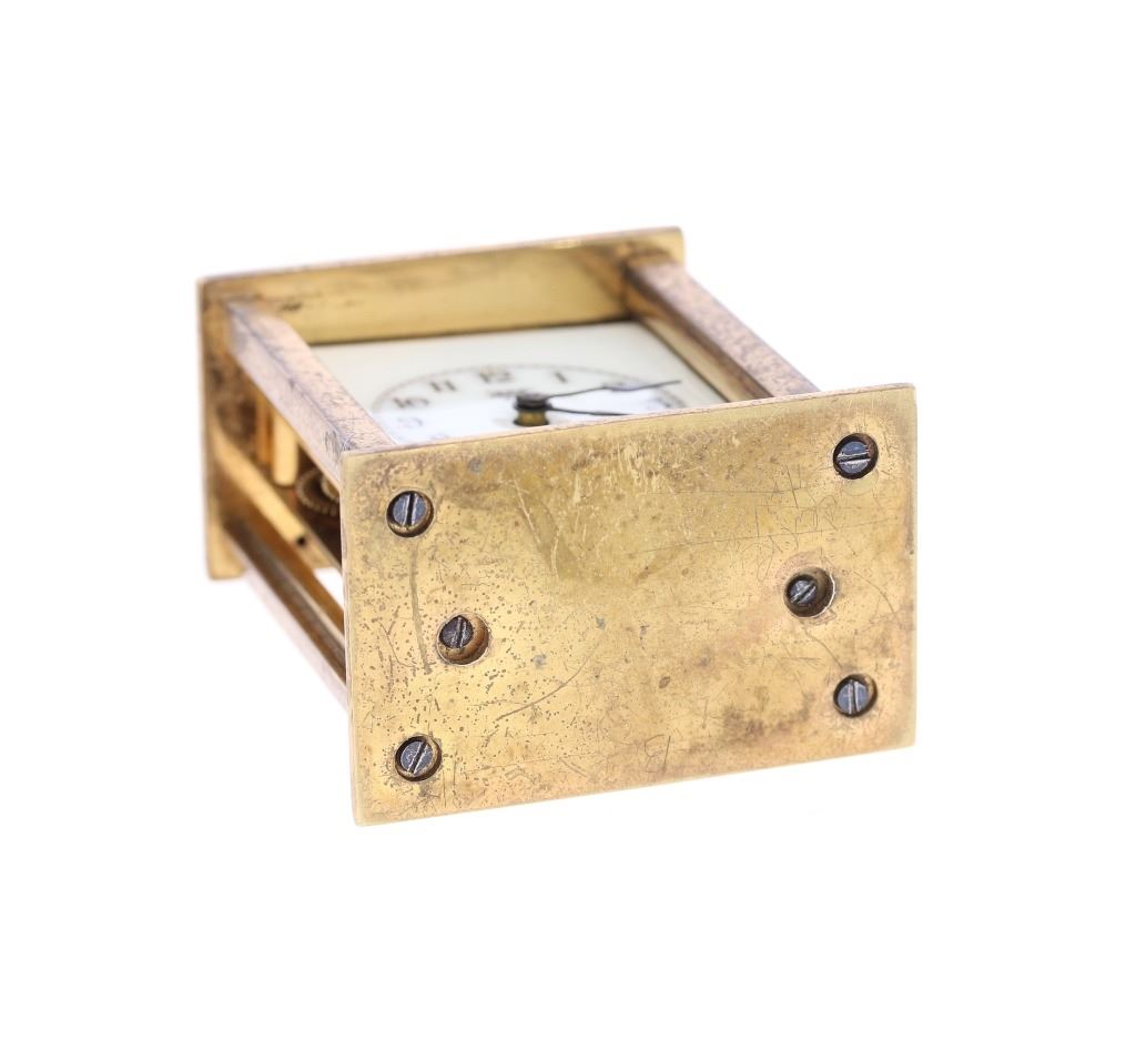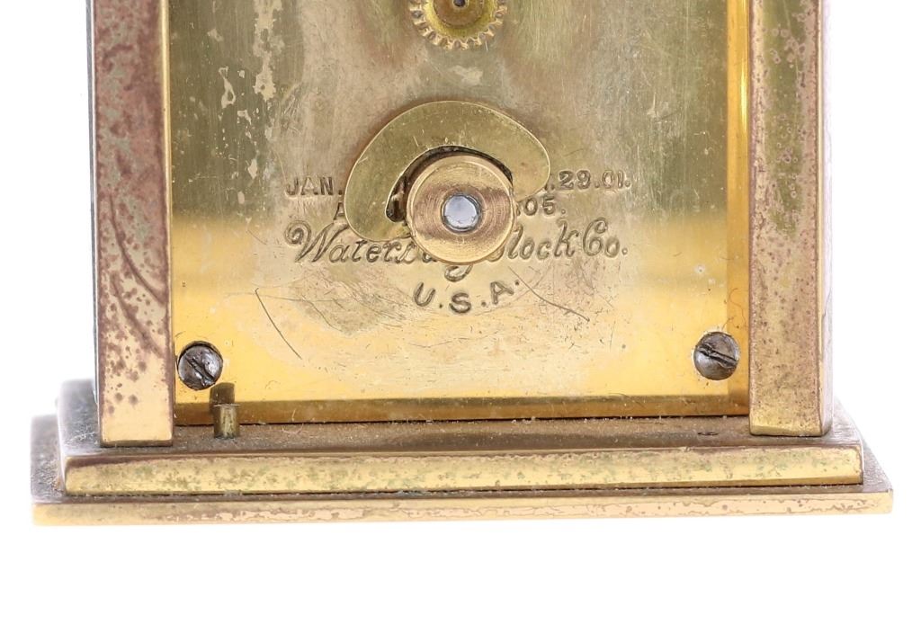 This is an original circa 1890-1920’s Waterbury Clock Co. brass carriage clock in a unique small size. The clock face is marked WATERBURY CLOCK CO. U.S.A. and on the back with the company name and shows patent dates in the 1890’s and 1901. This is truly a wonderful piece that is well kept and highly collectible. The clock has some patina and unknown working conditions. The measurements of this barometer is 2" x 1-3/8" x 2-7/16". The collective weight of this barometer is 6oz. Has beveled glass on one side, not the other or front.