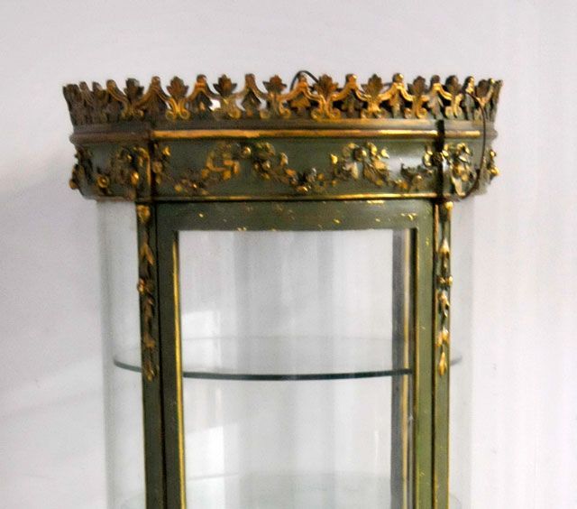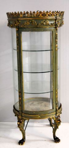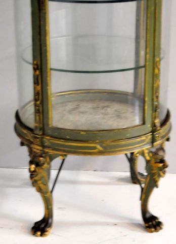 Giltwood & patinated green, with curved glass & glass shelves, claw feet with faces, crown molded top, "Flower & Bowknot" design, drapery all around cabinet, green felt bottom. Approx. 61.5" H x 26" Diam.