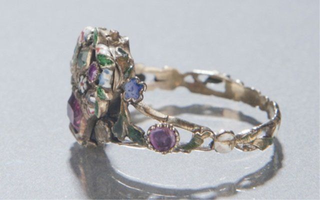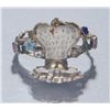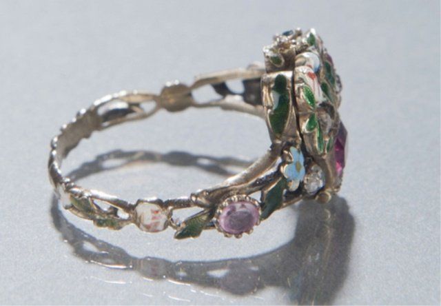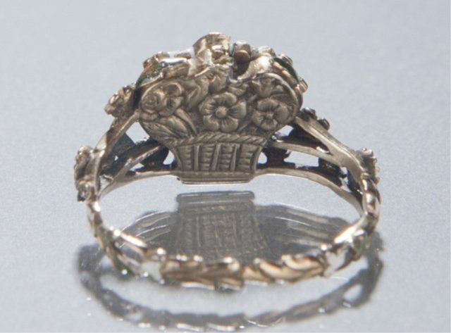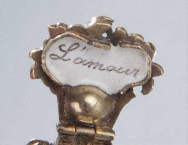 A late 19th c. Giardinetti locket ring. Locket opens up to white enamel with inscription "L`amour". Rubies, emeralds, and diamonds form the flower basket. Size 7. Tw 0.14 t oz.