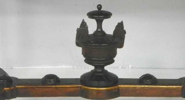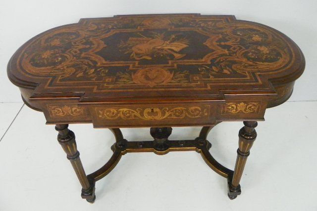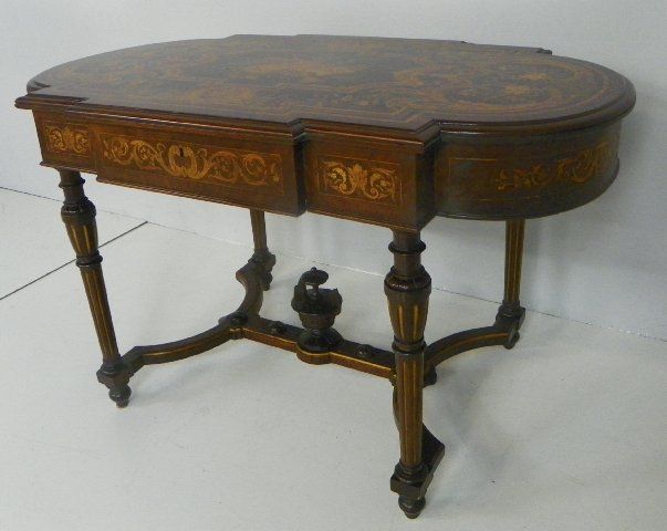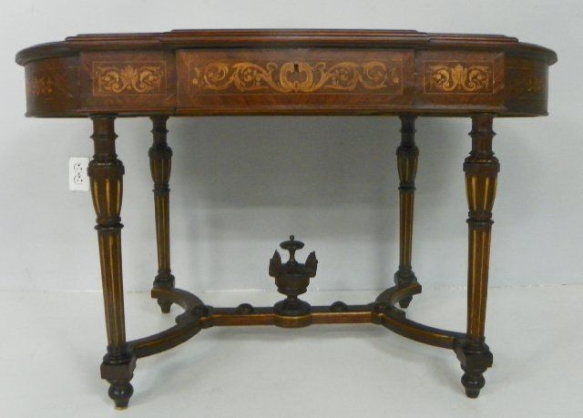 With multi colored wood & mother of pearl inlay, musical cartouche in center. Approx. 29" H x 48.5" L. From a Harrison, NY estate. Please read our terms of sale.