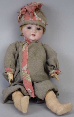 signed "German 143", jointed clay body with damage to right thumb, vintage clothing, hand painted bisque sleepy eye head, doll is good; clothing starting to deteriorate.