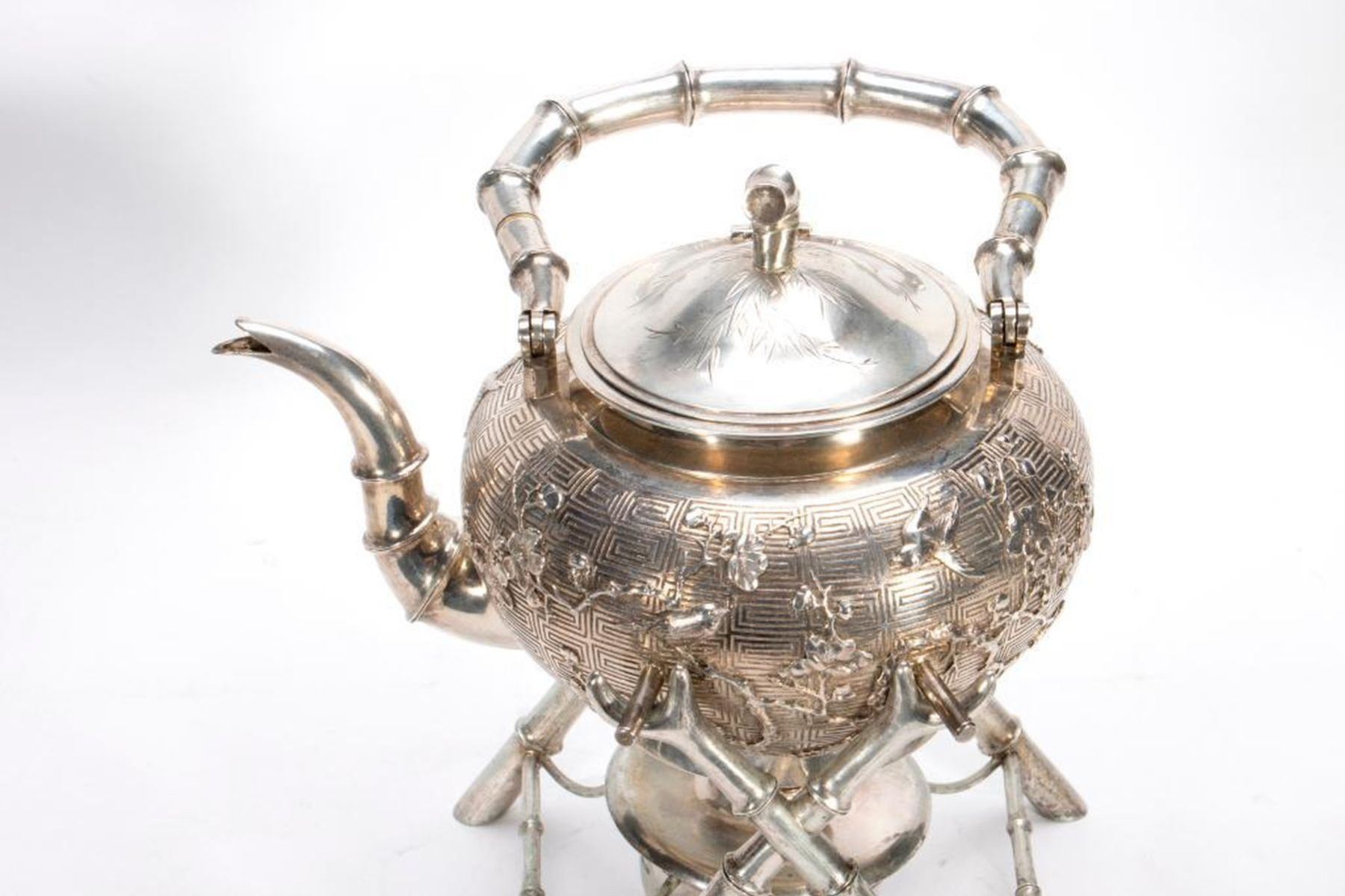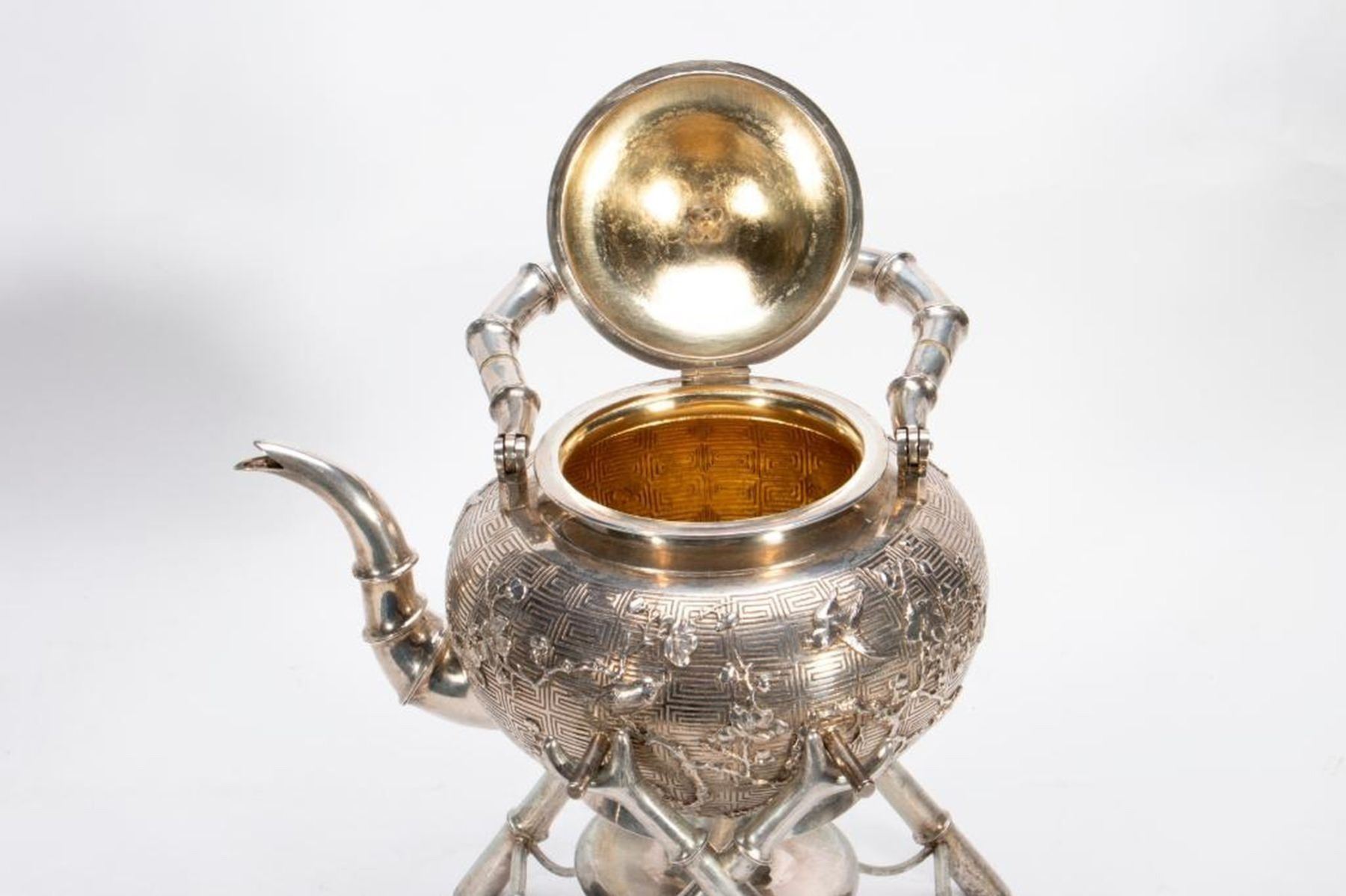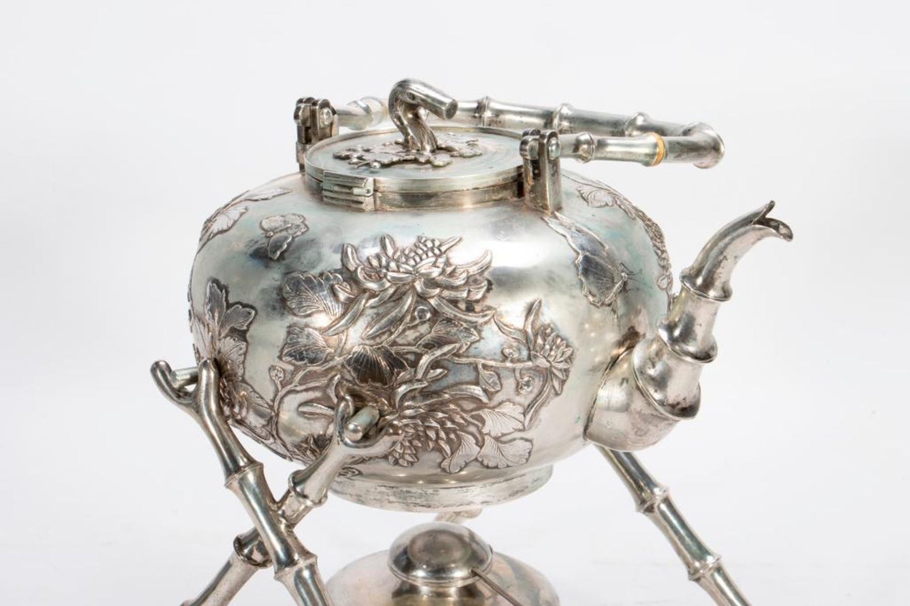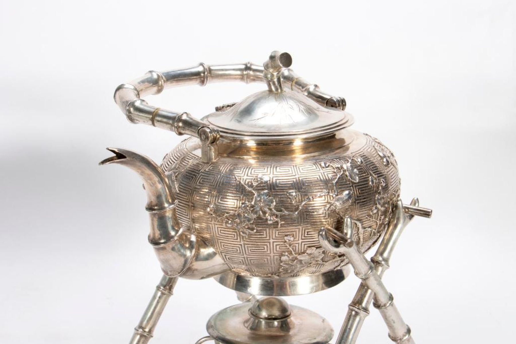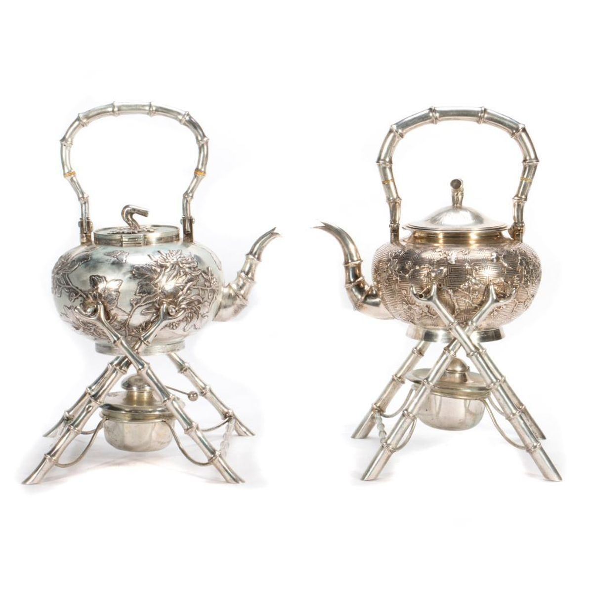 Two late 19th/early 20th Chinese silver teapots and warming stands. Both teapots, one warmer and one stand marked HC (Hung Chong). Teapots: 8" and 9" Weight: 2238 g