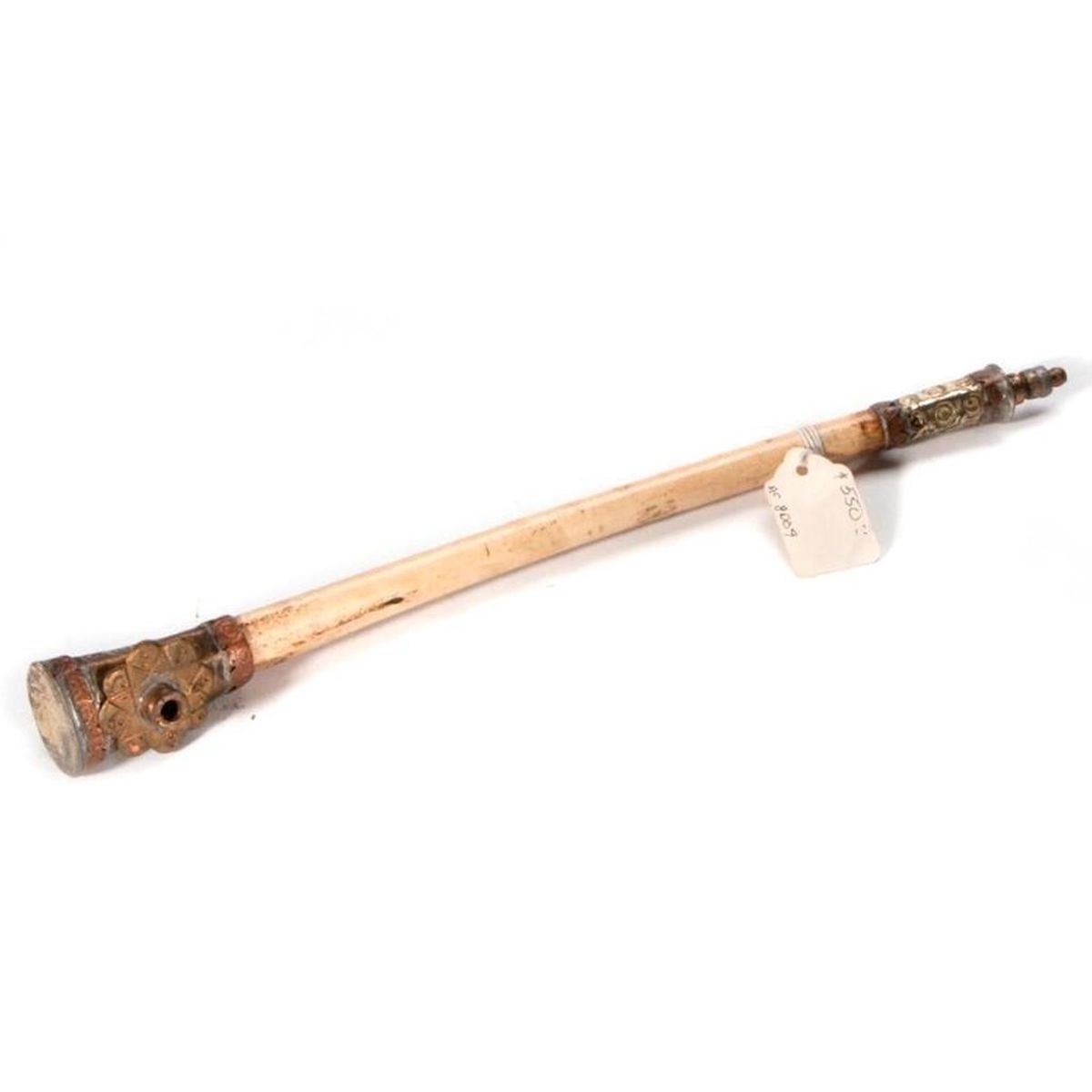 A 20th century Chinese opium pipe with bone shaft and decorated metal caps. 13 1/2 inches in length.