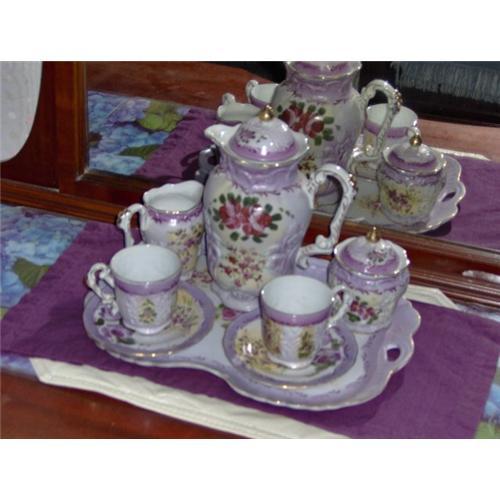 This tea set is beautifully decorated in handpainted lavender and deep purple roses! It comes with a large teapot with a lid, a sugar bowl with a lid, a creamer, two (2) cups and saucers, and a large serving tray. The rose design is stylized and quite fetching!<p>