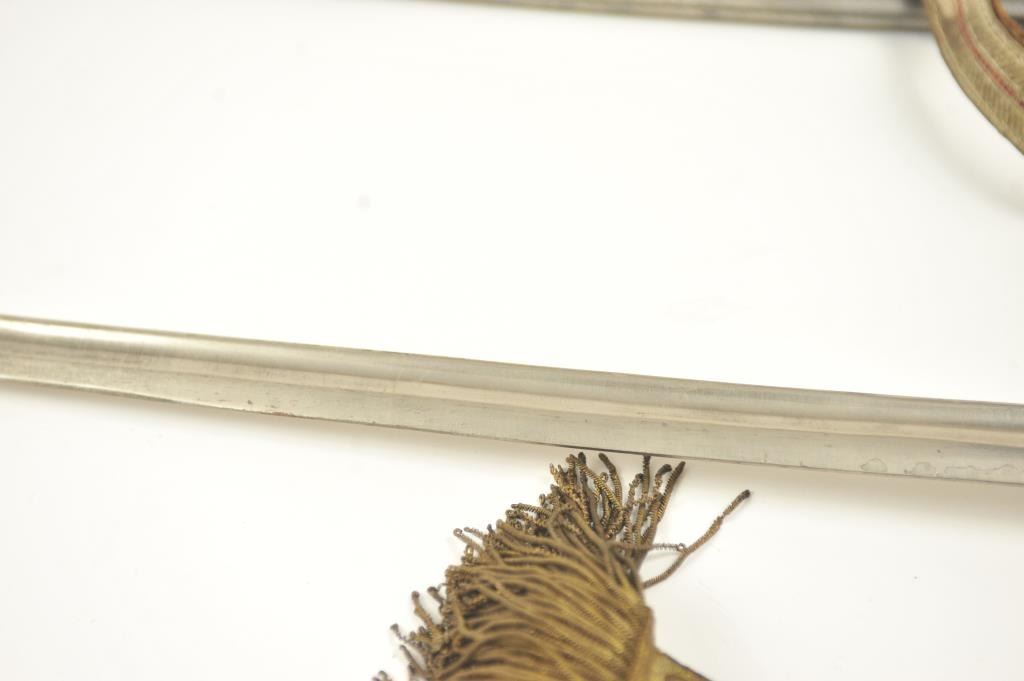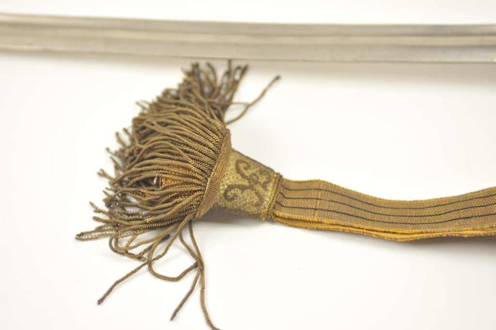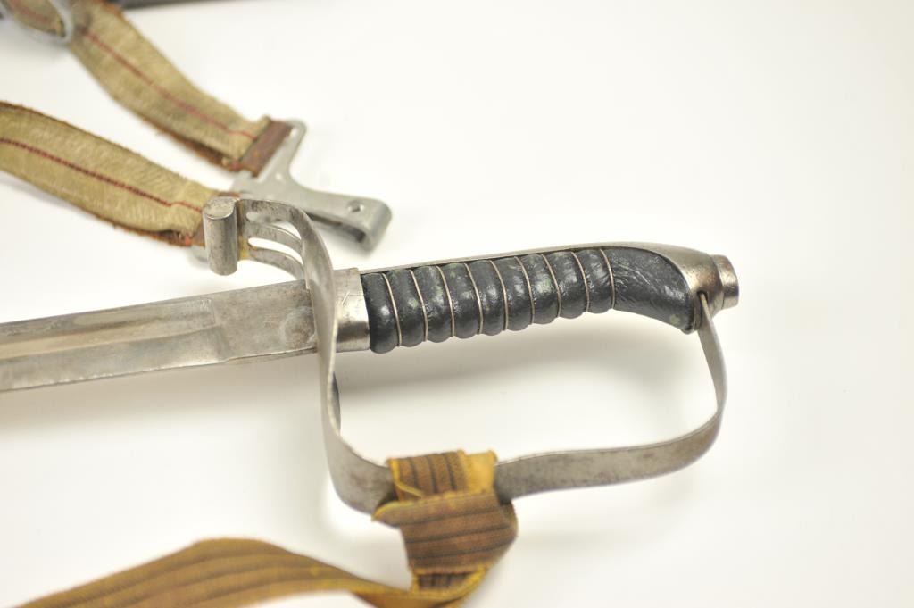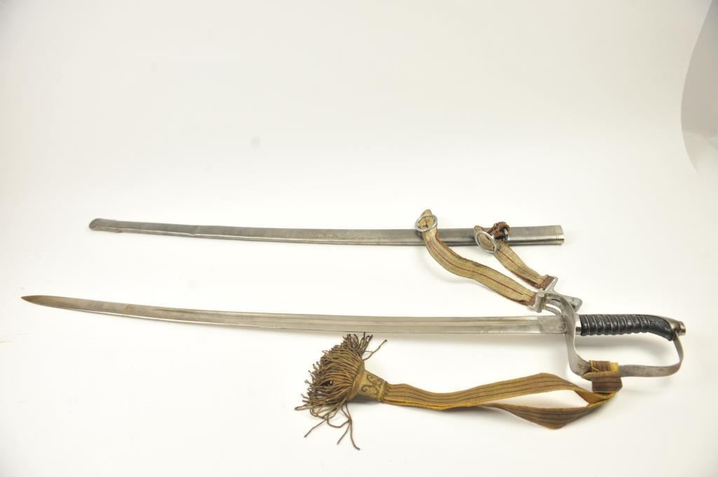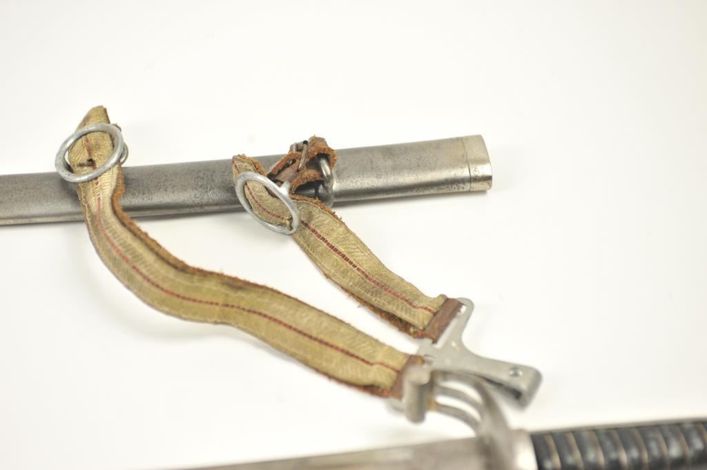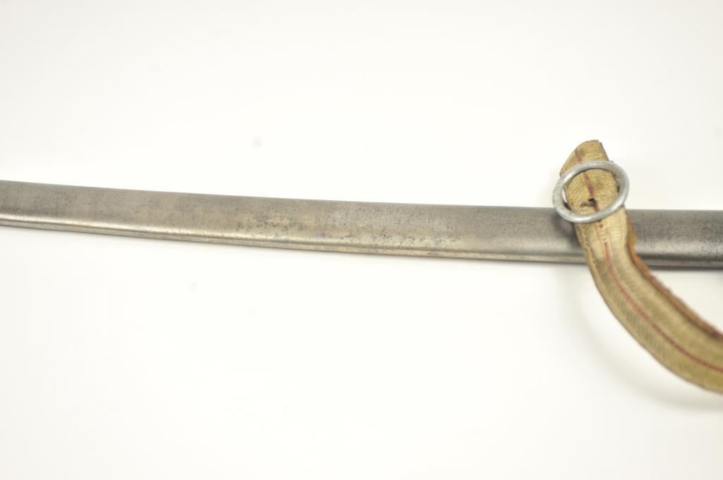 Late 19th to early 20th century D guard cavalry style sword in Austrian style with no maker’s or I.D. marks on the blade or hilt. Fancy original embroidered sword knot with “K”. Also fancy embroidered hanger genuine to this sword. Lightly cleaned gray metal and good overall. Indecipherable mark on the Ferrell. Some pitting on the scabbard. Est.: $100-$200