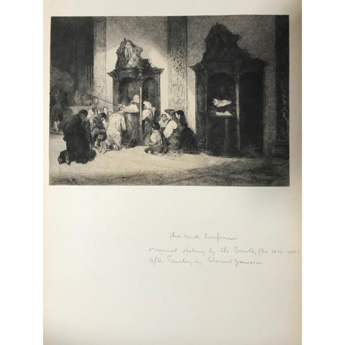 Original late 19th Century ( 1892 ) etching by C. Courtry " The Kind Confessor" also known as "The Good Pastor" from the original painting by Edourad Zamacois y Zabala ( Madrid Spain, 1841 - 1871 ). 7" X 9 3/4"  displayed within portfolio. The Kind Confessor " variously known as " The Good Pastor " & " Rival Confessors " is one of the best-known paintings of one of the most eminent Spanish painters of the latter half of the century. By birth, Zamacois was a Spaniard but by education he belongs to the French school, & was, in fact, a pupil of Meissonier. Although he usually selected subjects attuned to his racial feelings, he was nevertheless regarded in his native country as something of an alien. A past master of the craft of painting, he was essentially a man of wit—a satirist, a Thackeray who worked with the brush instead of with a pen. A " literary " painter par excellence, he probably equalled his master in his power of the brush & the resources of his art; and it might be added, had he possessed a sense of poetry equal in degree to his sense of humour, he might have taken his place among the first painters of this age. Â