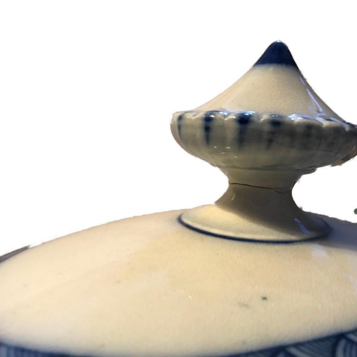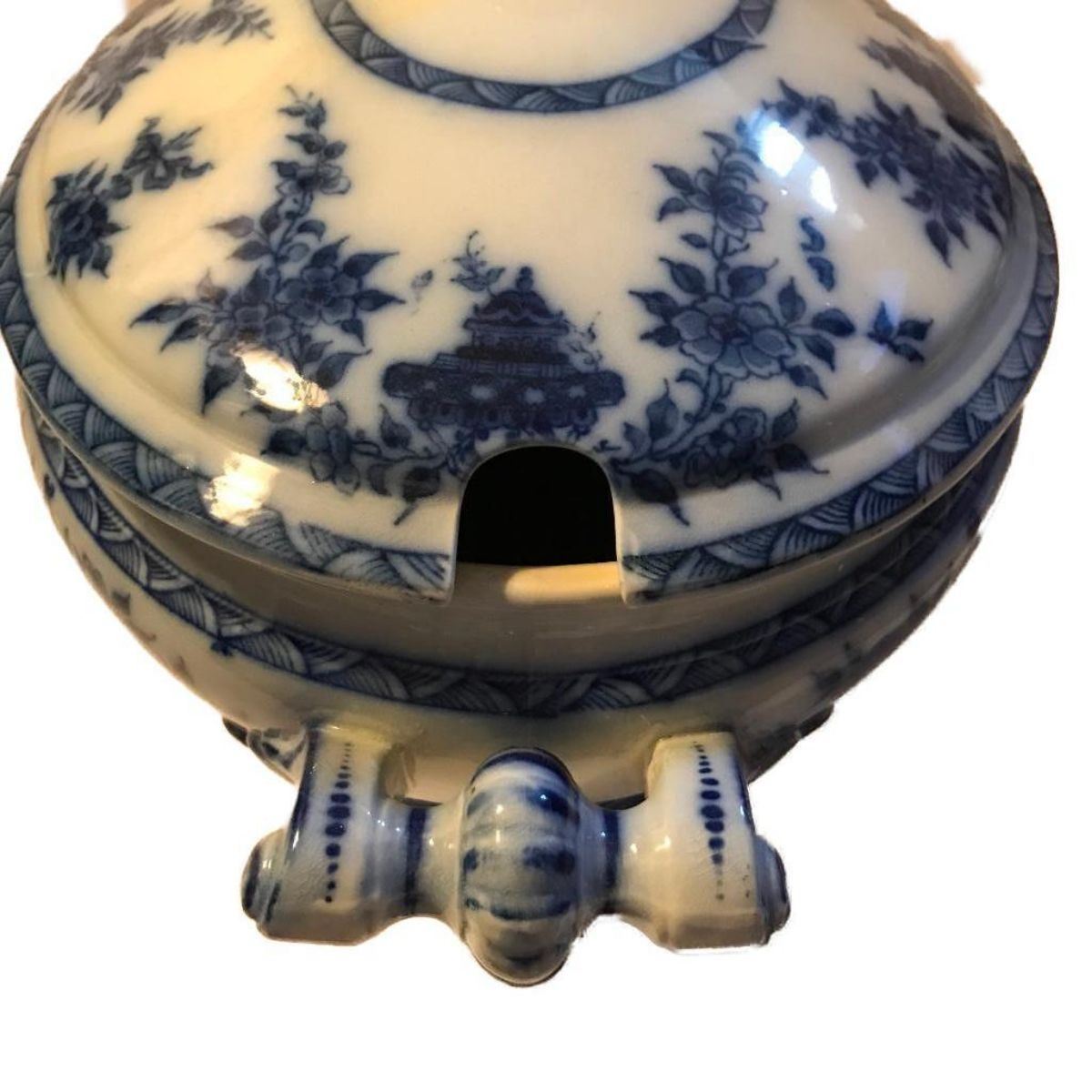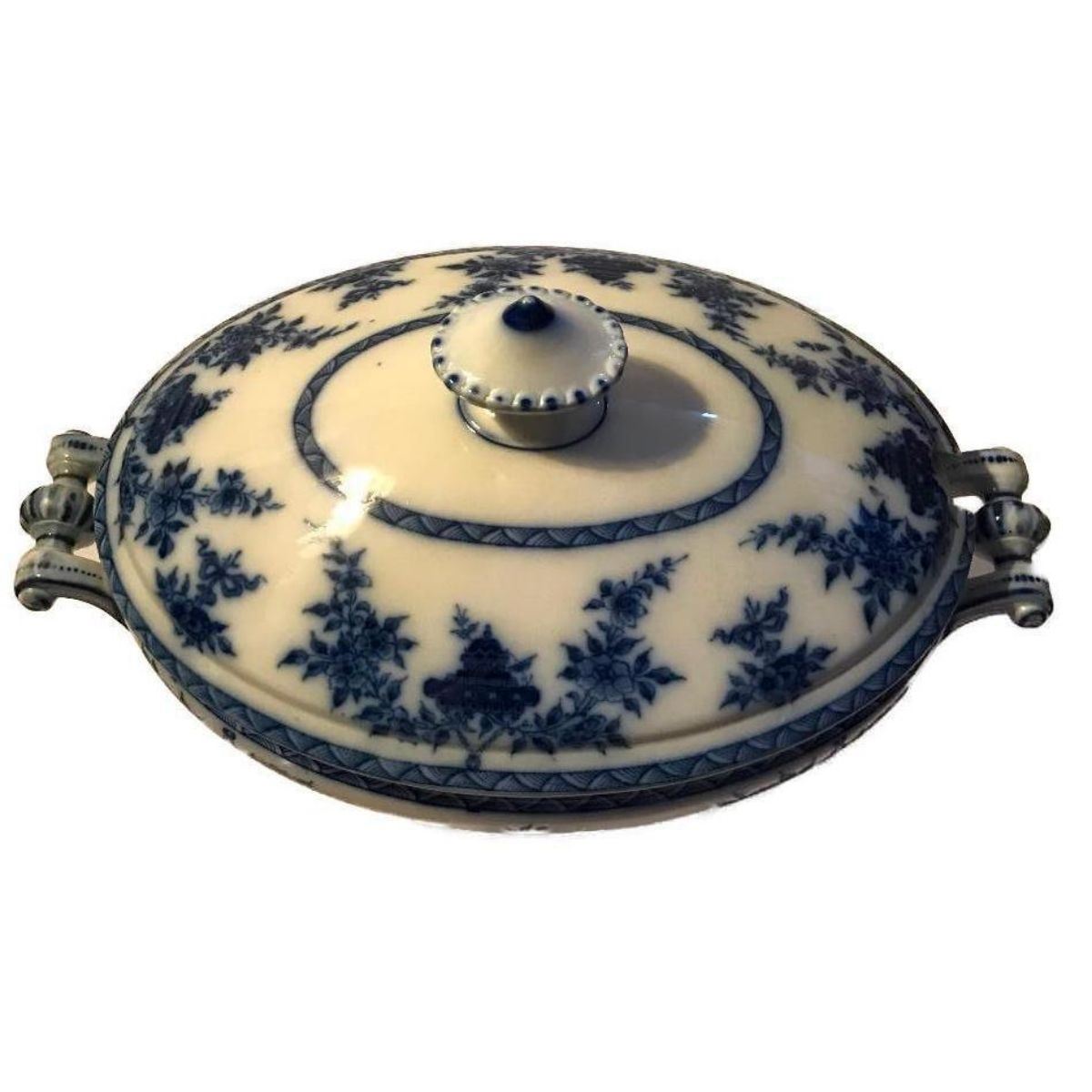 19thc ( c1870's ) T. Furnival & Sons ( Elder Road Cobridge Staffordshire ) Bombay pattern flow blue large ironstone tureen serving dish with elaborate handles. 16" L X 9" W X 12" H. Unmarked but has a 4, II, & a P impressed in the bottom. In good condition considering age, with some browning to the inside bottom & base. *  a repair to the lid's handle, as seen in photo.