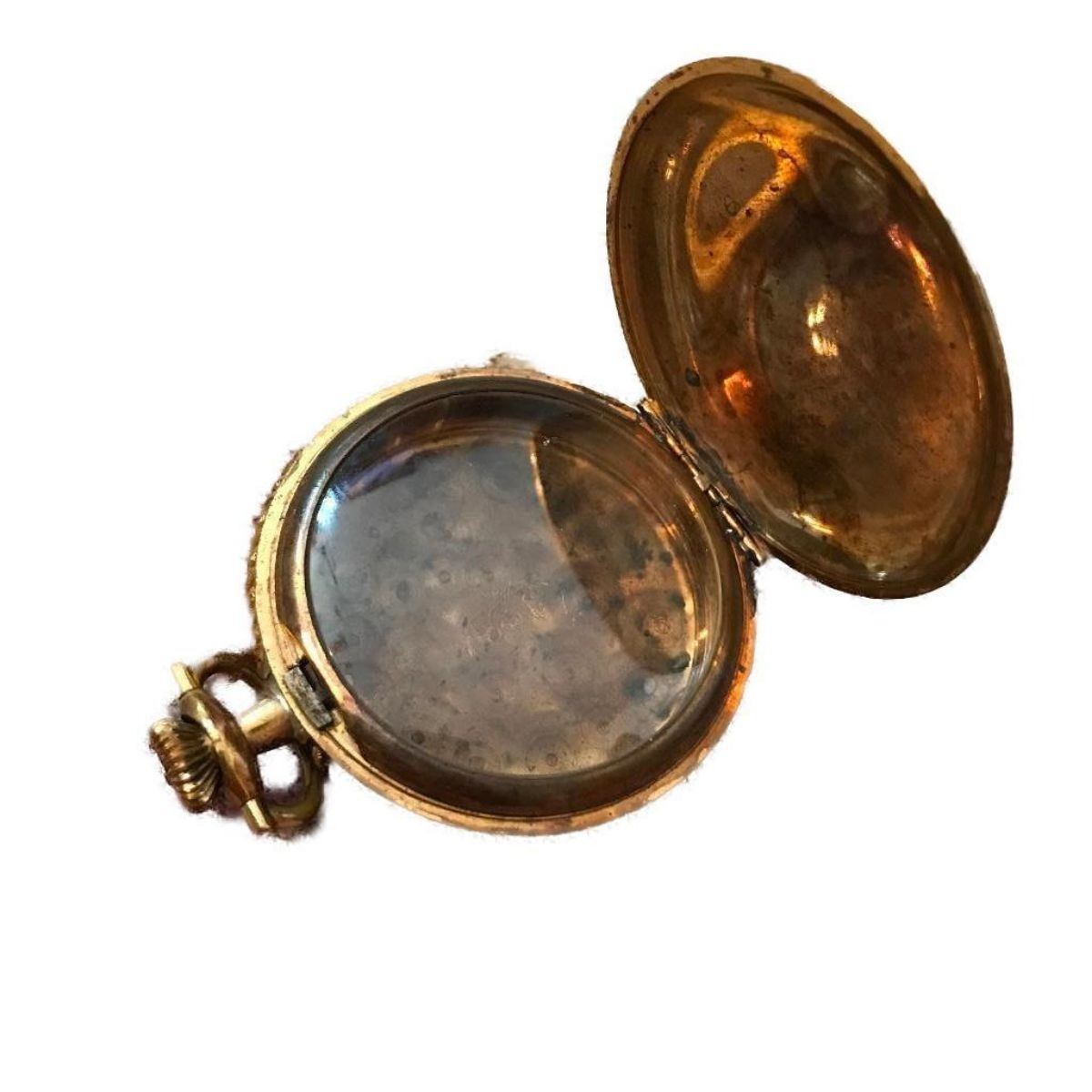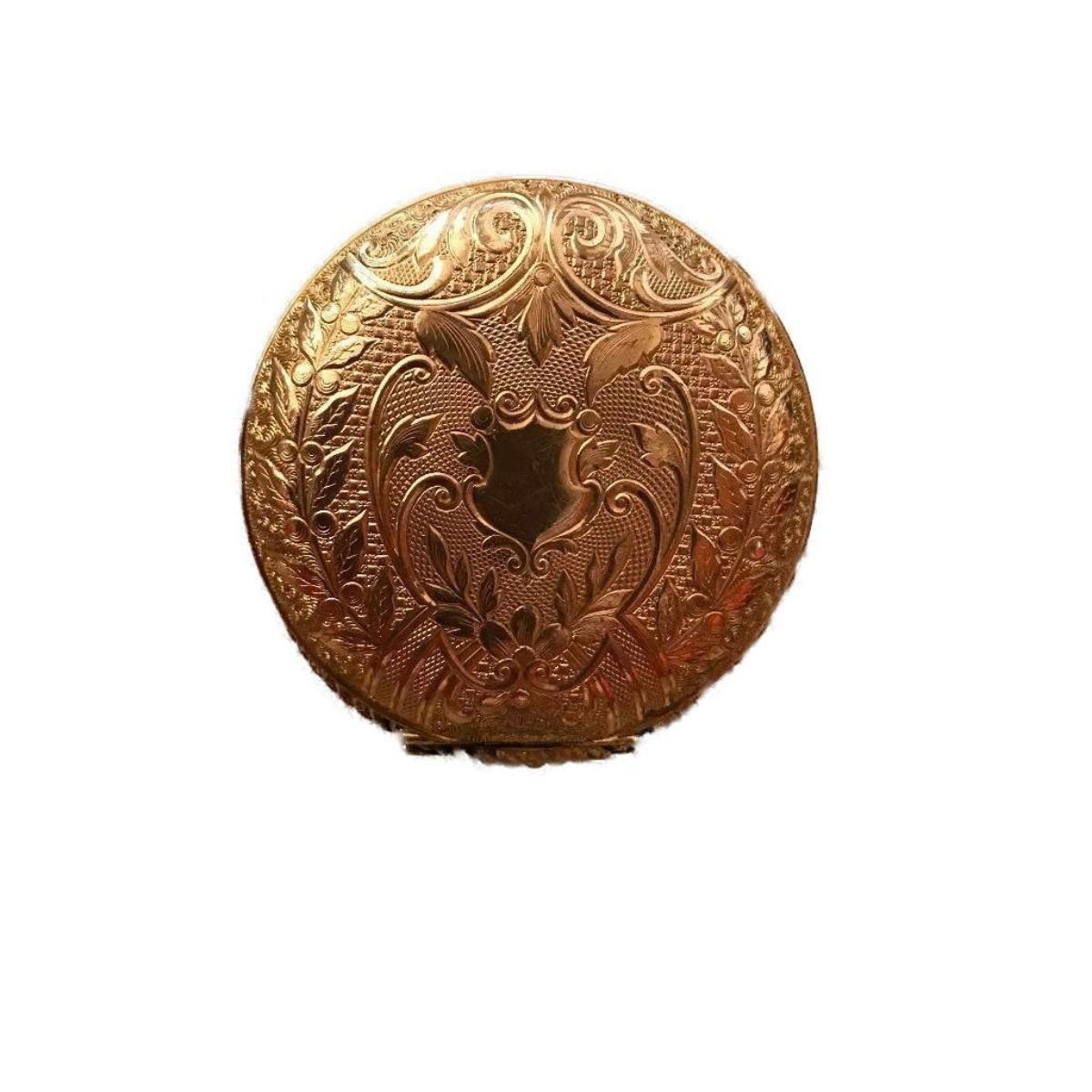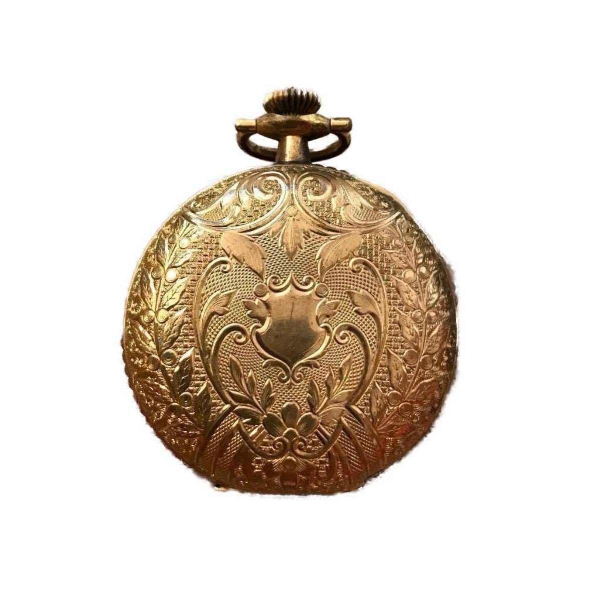 Late 19th Century gold Victorian pocket watch case ( c1890's ) ornately engraved with lovely back & front cartouche, with Indian head hallmark of the Kenosha Watch Case Co. 2 3/4" H X 2" W.